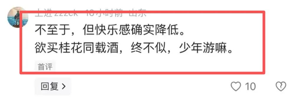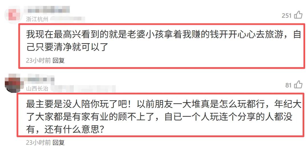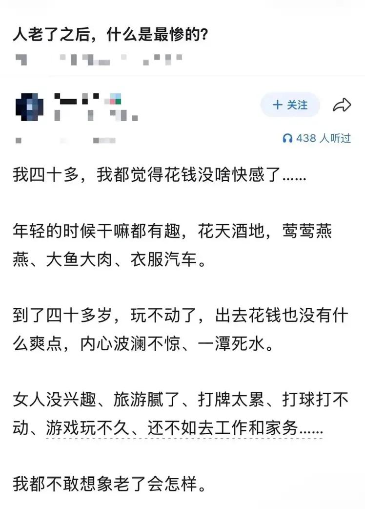 一位浙江网友发文称,现在40岁,干什么都提不起兴致。花钱没快感,连女人都没兴趣了。 这位网友看来是财务自由了。什么都不用干,不愁吃穿,纯粹是“无病呻吟”。有多少年轻人为了生计,送外卖送快递,风里来雨里去,也感受不到生活的乐趣,但是他们为了原生家庭,为了小家庭,还在努力工作。 这位大哥如果干什么都兴致缺缺,那就去偏远山区做做义工,一定会找到活着的动力,找到自己的价值,不然就是一具行尸走肉。