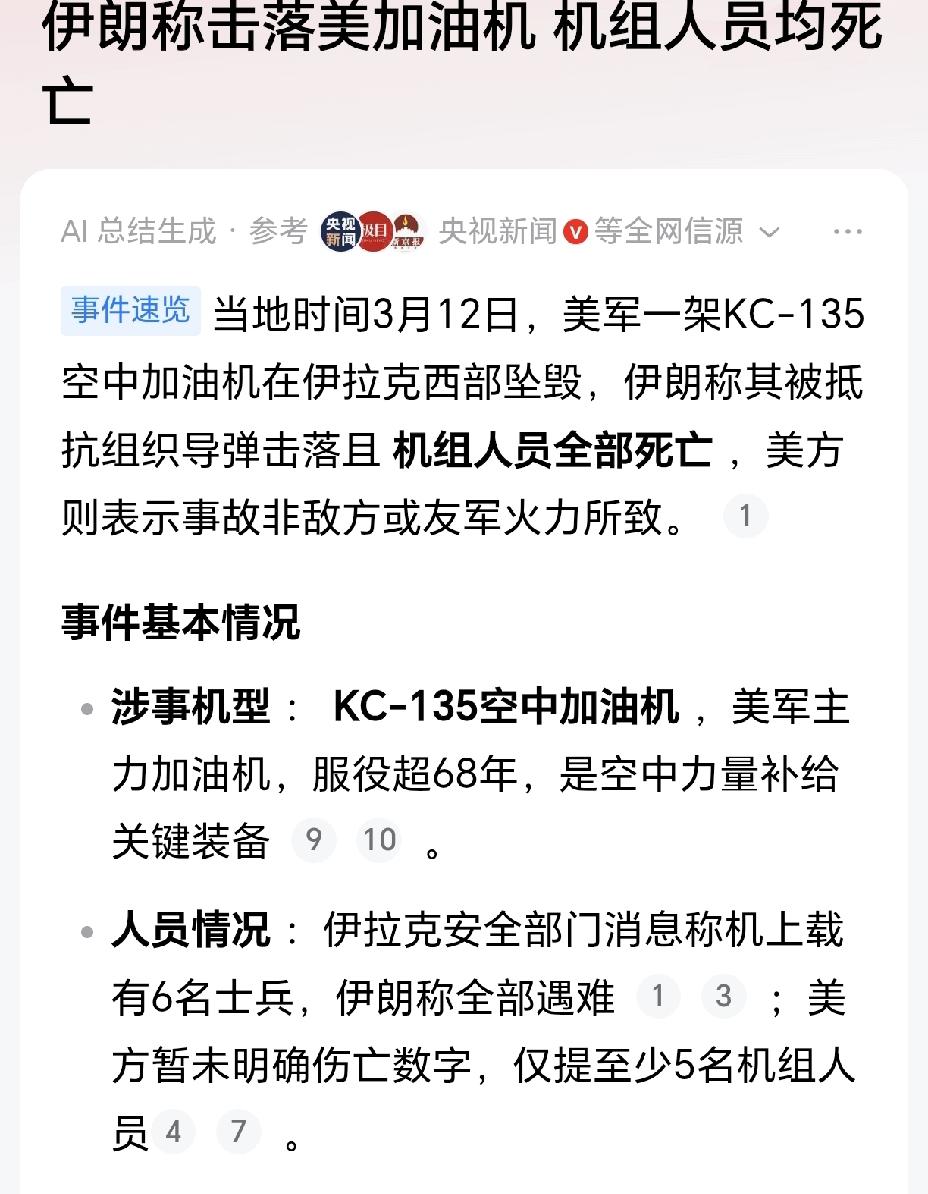 美军一架空中加油机在伊拉克坠毁,消息一出引发全球关注。 美方随即通报称,飞机并非遭敌方或友军火力击落,言外之意,将事故原因指向了自身机械故障。 有网友一针见血,但凡美军军机出事,不是机械故障,就是自家误击,几乎从不承认是被对手击落,这套说辞如今听来,和阿三的操作已是如出一辙。 不少人也感慨,美军怕是早已忘了1994年“黑鹰坠落”的狼狈——在索马里被当地武装重创,最后还是靠着他国装甲车掩护才得以撤离。美军无人机事故 美军击落无人机 南海美军坠机 美军F15坠毁 伊朗军机坠毁 阿联酋战机 科威特击落美机