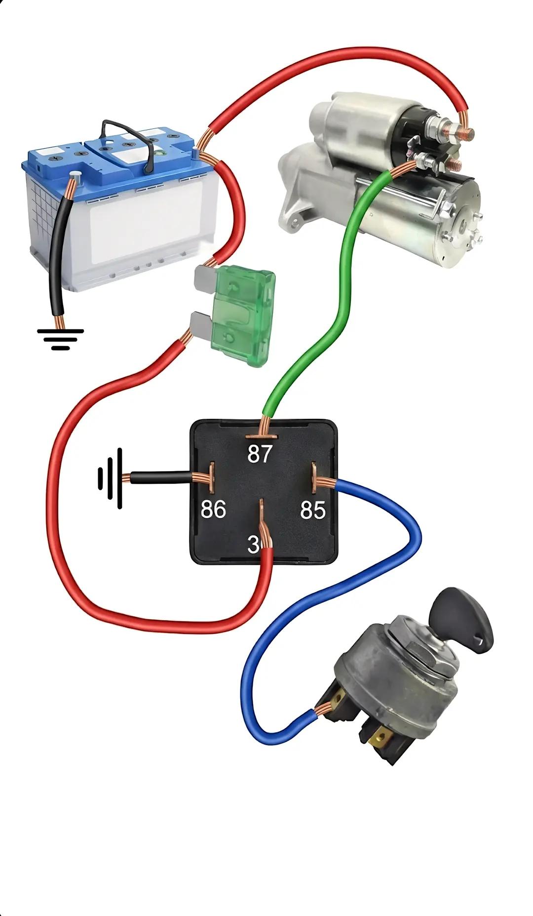 🚗 车打不着火?1分钟看懂启动机接线图! 👇 先别急着叫拖车!先检查这个! 是不是拧钥匙时没反应,或者只有“咔哒”一声?😤 很多时候问题根本不在启动机或电瓶,而是接线不对、接头氧化了! 今天咱们讲最经典、最靠谱的4脚继电器启动机接线法,这是每个司机和DIY修车党都该懂的汽车电工基础! 赶紧收藏,下次在车库就能直接用! ⚙️ 原理大白话 这套方案的核心是给点火开关减负: - 点火开关只走小电流,用来控制继电器 - 继电器再接通大电流,带动启动机转动 这样就不会烧蚀点火开关触点了! 🛠️ 分步拆解(对照图看) 1️⃣ 电瓶(АКБ) 整个系统的“动力心脏” - 粗红线:直接连到启动机的电磁开关(大接线柱) - 黑线(搭铁):必须牢牢固定在车身或发动机上!没搭铁=打不着火 2️⃣ 点火开关 拧钥匙到“START”挡时,电流会顺着蓝线走,但不是去启动机,而是去继电器的控制端(85号脚) 3️⃣ 核心主角——4脚继电器 这是防止烧点火开关的关键部件! - 30号脚:常火线(+),从电瓶经保险丝过来 - 87号脚:火线输出(+),连到启动机电磁开关的控制接线柱(绿线) - 86号脚:搭铁(-),给继电器供电回路 - 85号脚:控制火线(+),来自点火开关 ⚡ 电路逻辑 拧钥匙 → 电流到85号脚 → 继电器线圈吸合 → 大电流从30号脚流向87号脚 → 启动机开始转动!🚀 ⚠️ 为什么要这么接? 很多老车或“野路子”改装,会让大电流直接过点火开关,结果就是触点烧熔、车打不着。按这个方案装个减负继电器,就能彻底解决问题!✅ 💡 老师傅的建议 - 一定要在30号脚的火线上加保险丝!(就像图里那样),能防止短路起火 - 重点查搭铁!90%的启动机问题,都是负极线和车身接触不良 - 用对电线粗细:大电流用粗线,控制线用细线 💬 你遇到过启动机故障吗?最后是怎么修好的?是重新接线还是换件了?评论区聊聊! 电动机接线教程 继电器控制原理