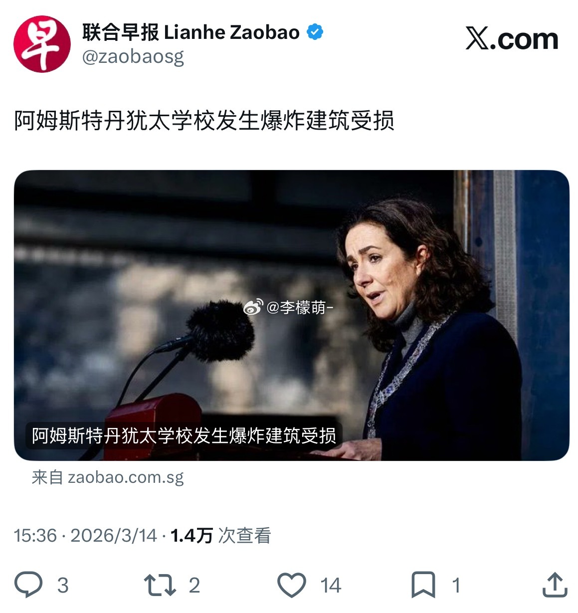 坐落在荷兰首都阿姆斯特丹的一所犹太学校星期六(3月14日)清晨发生爆炸,学校建筑受损。