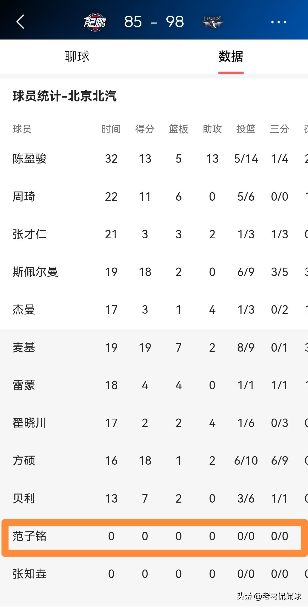 北京北汽主帅许利民真是太不尊重范子铭了!在今天北京北汽客场以98:85战胜广州朗肽海本的比赛中,当时距离全场比赛结束还剩最后的18.7秒,北京北汽以95:82领先对手,基本上胜局已定了。这个时候只见北京北汽主帅许利民大手一挥用范子铭替下了周琦,然而纵然范子铭拥有无与伦比的篮球天赋,他也不可能在短短的18.7秒的时间里掀起什么风浪,最终范子铭没有得到任何的表现机会,怒砍0分0篮板0助攻0抢断0盖帽。 在我看来,许利民教练以这样的方式对待顶薪球员范子铭是缺乏尊重的,毕竟从本场比赛的形势来看,许利民教练完全可以早点派范子铭上场。