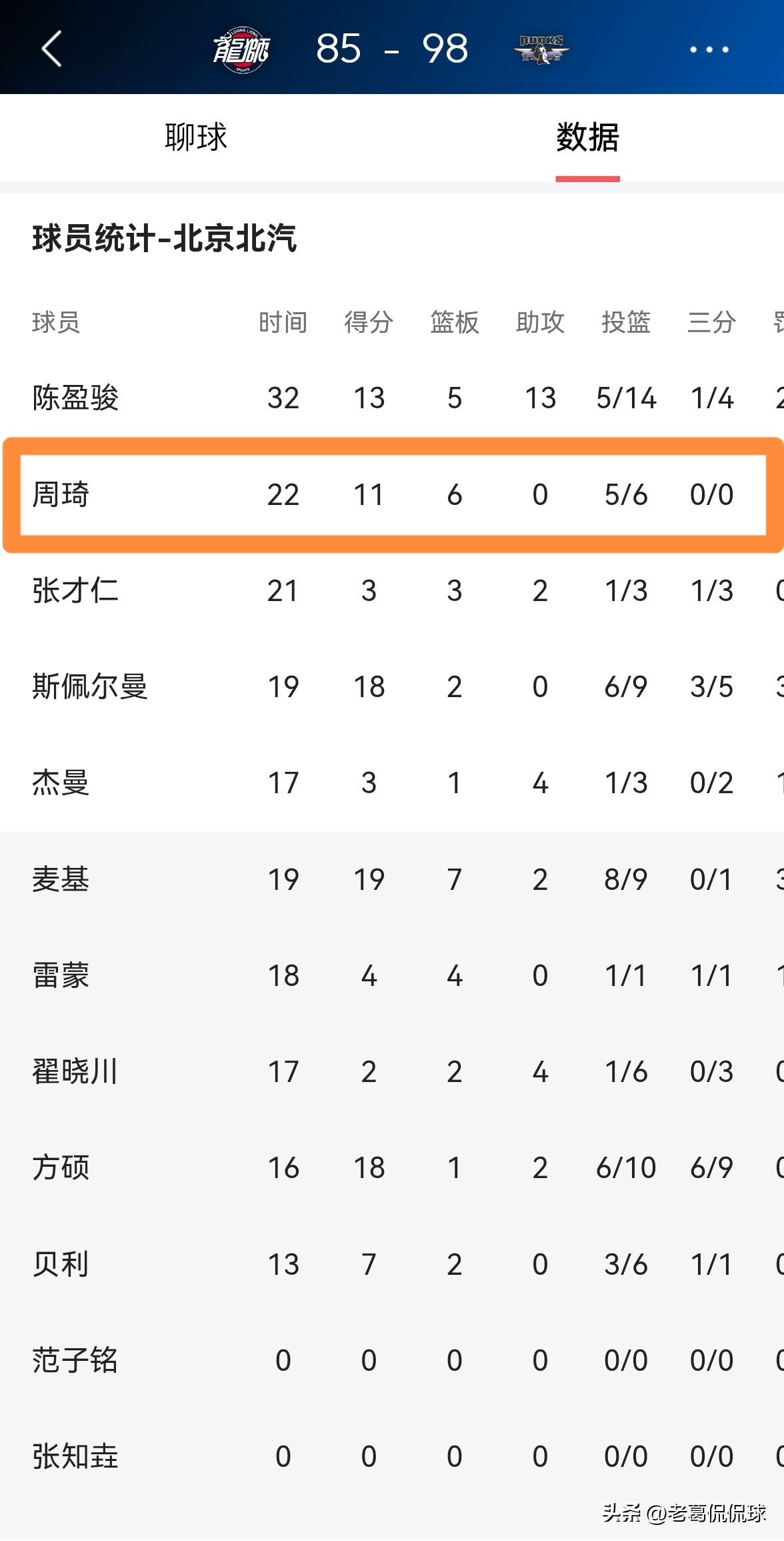 北京北汽巨星周琦真是攻防俱佳!在今天北京北汽客场以98:85击败广州朗肽海本的比赛中,周琦在攻防两端都打出了无可争议的表现。 全场比赛下来,周琦首发出战22分钟,投篮6中5,其中罚球3中1非常高效的砍下11分,还有6篮板1抢断2盖帽,没有出现任何的失误,他的场上正负值为+6。 周琦不愧是当今CBA最强中锋之一,最让人感到不可思议的是,周琦还没有恢复到自己的最佳状态。一旦周琦恢复到自己的最佳状态,他和麦基组成的内线双塔将会统治CBA的篮下。