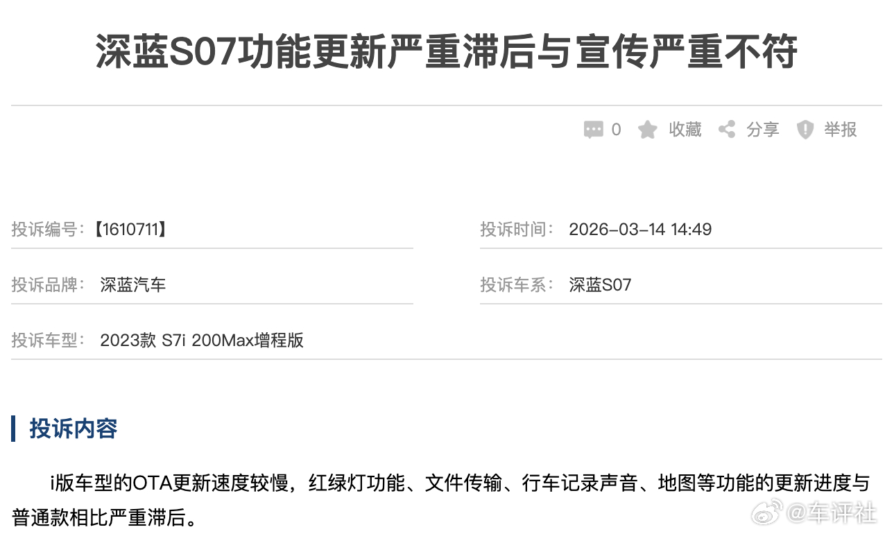汽车315 线上车展 【深蓝S07功能更新严重滞后与宣传严重不符车】有网友投诉称,他购买的是一台2023款 S7i 200Max增程版,其i版车型的OTA更新速度较慢,红绿灯功能车、文件传输、行车记录声音、地图等功能的更质新进度与普通款相比严重滞后。据车评社了解,2023款 S7i 200Max增程版官方售价为18.49万元,定价贴合定位,兼顾家用与续航实用性,性价比表现中肯。如果您也遇到同类问题欢迎留言。车评观察车评观察