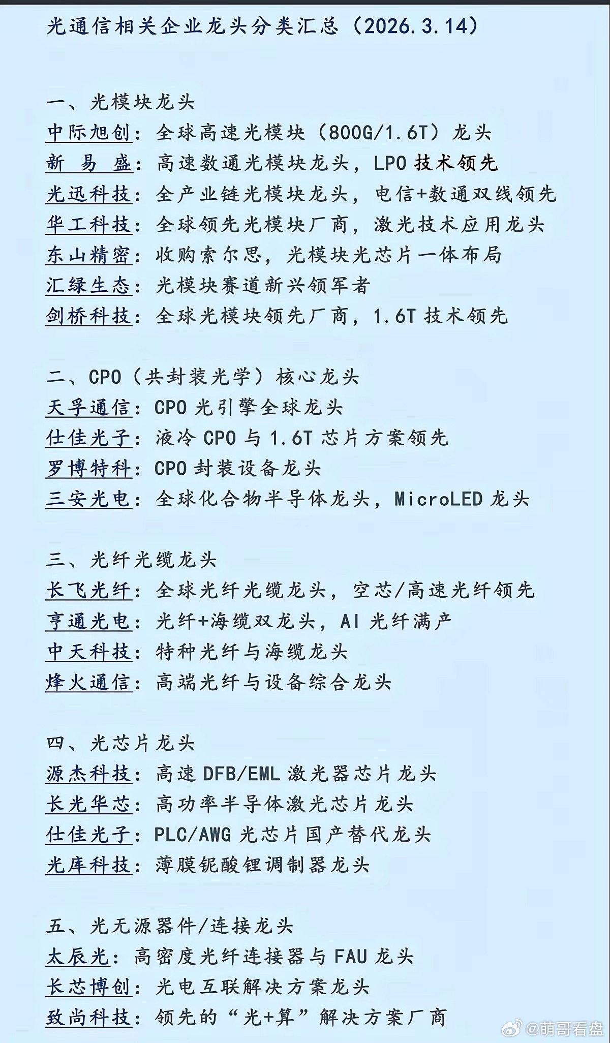 3.14下周:全球瞩目!2026光通信大会!下周:3月17日~3月19日,美国洛杉矶,将召开第51届光纤通信会议!相关核心龙头股获关注:1.光模块龙头2.CPO共封装光学3.光纤光缆4.光芯片5.上游材料/设备龙头
