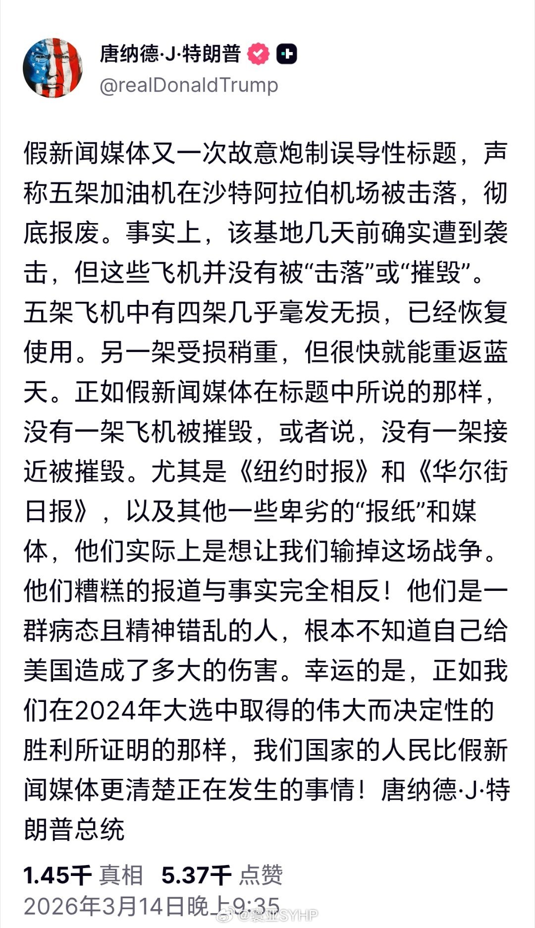 特朗普否认美军加油机在沙特受损 特朗普发文:假新闻媒体又一次故意炮制误导性标题,声称五架加油机在沙特阿拉伯机场被击落,彻底报废。事实上,该基地几天前确实遭到袭击,但这些飞机并没有被“击落”或“摧毁”。五架飞机中有四架几乎毫发无损,已经恢复使用。另一架受损稍重,但很快就能重返蓝天。