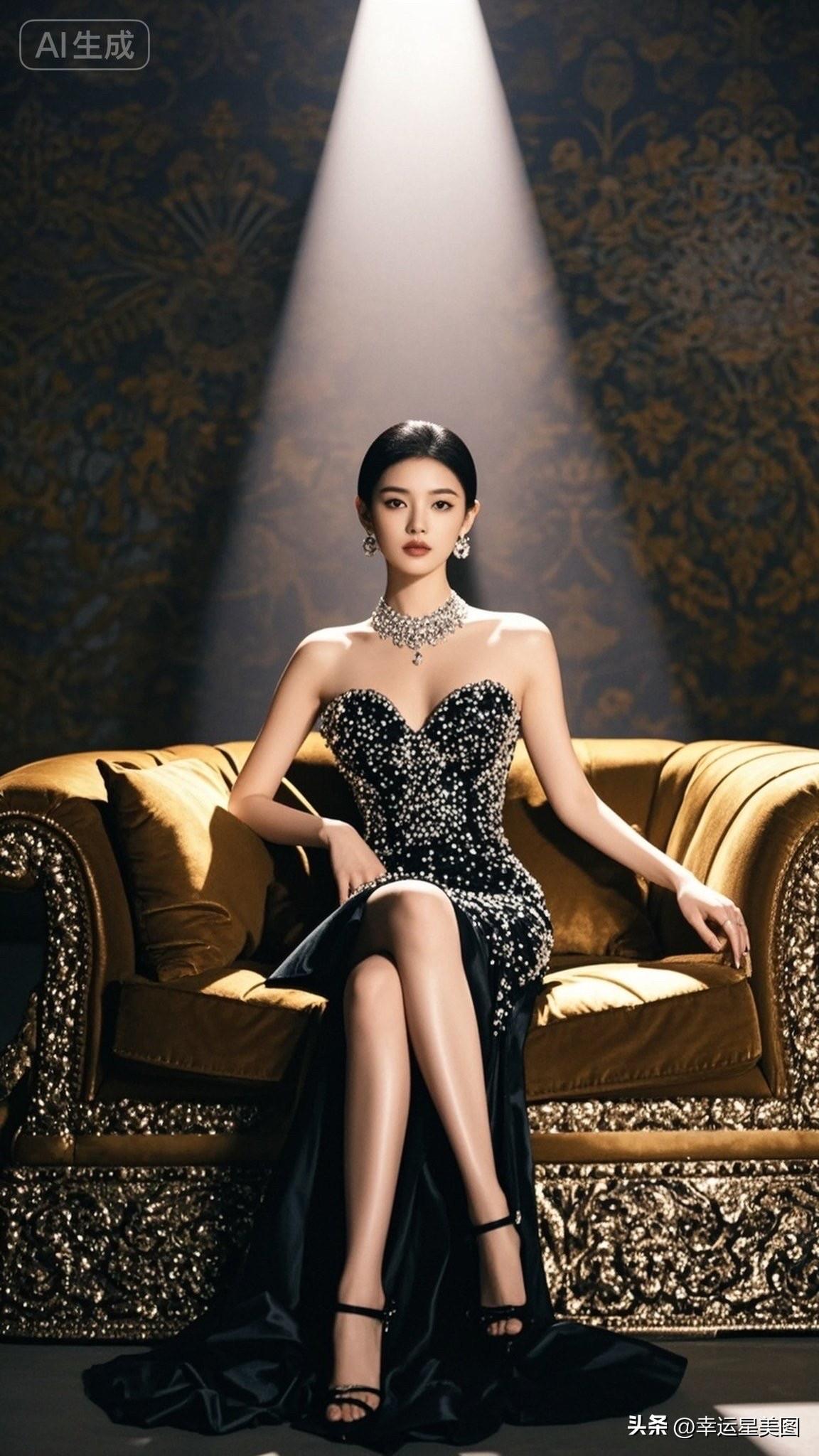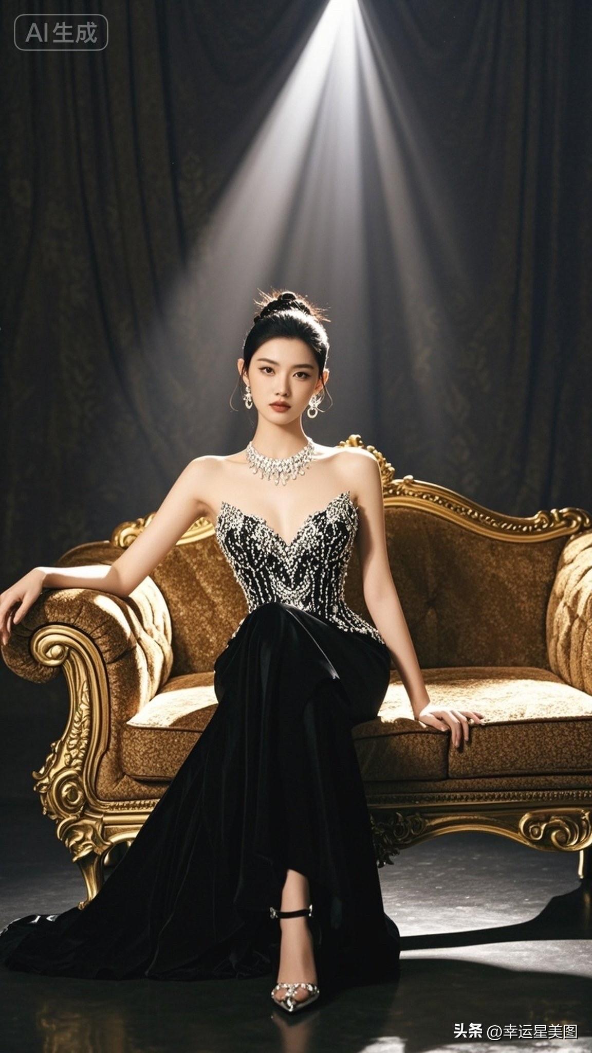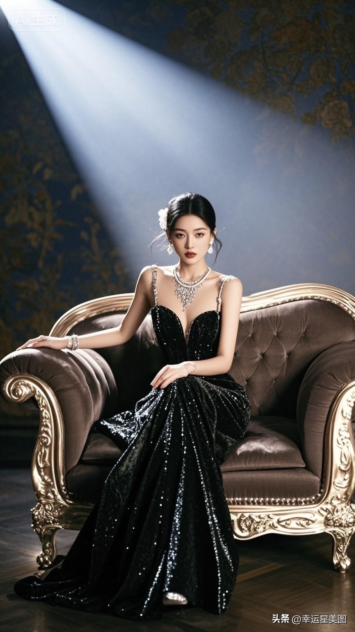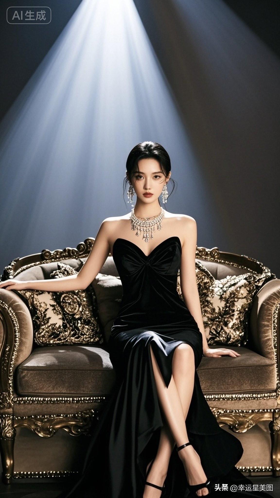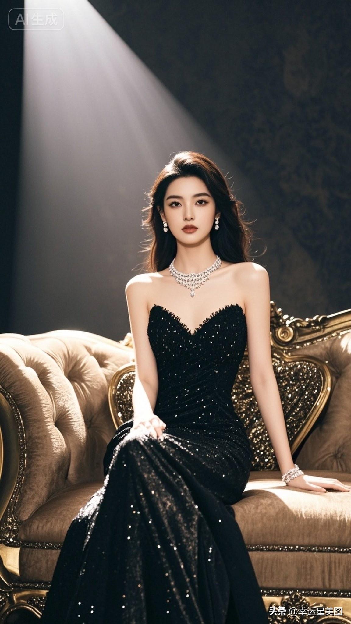 黑纱裙的梦幻女王,闪耀的珠宝,奢华的沙发,AI生成的完美瞬间。