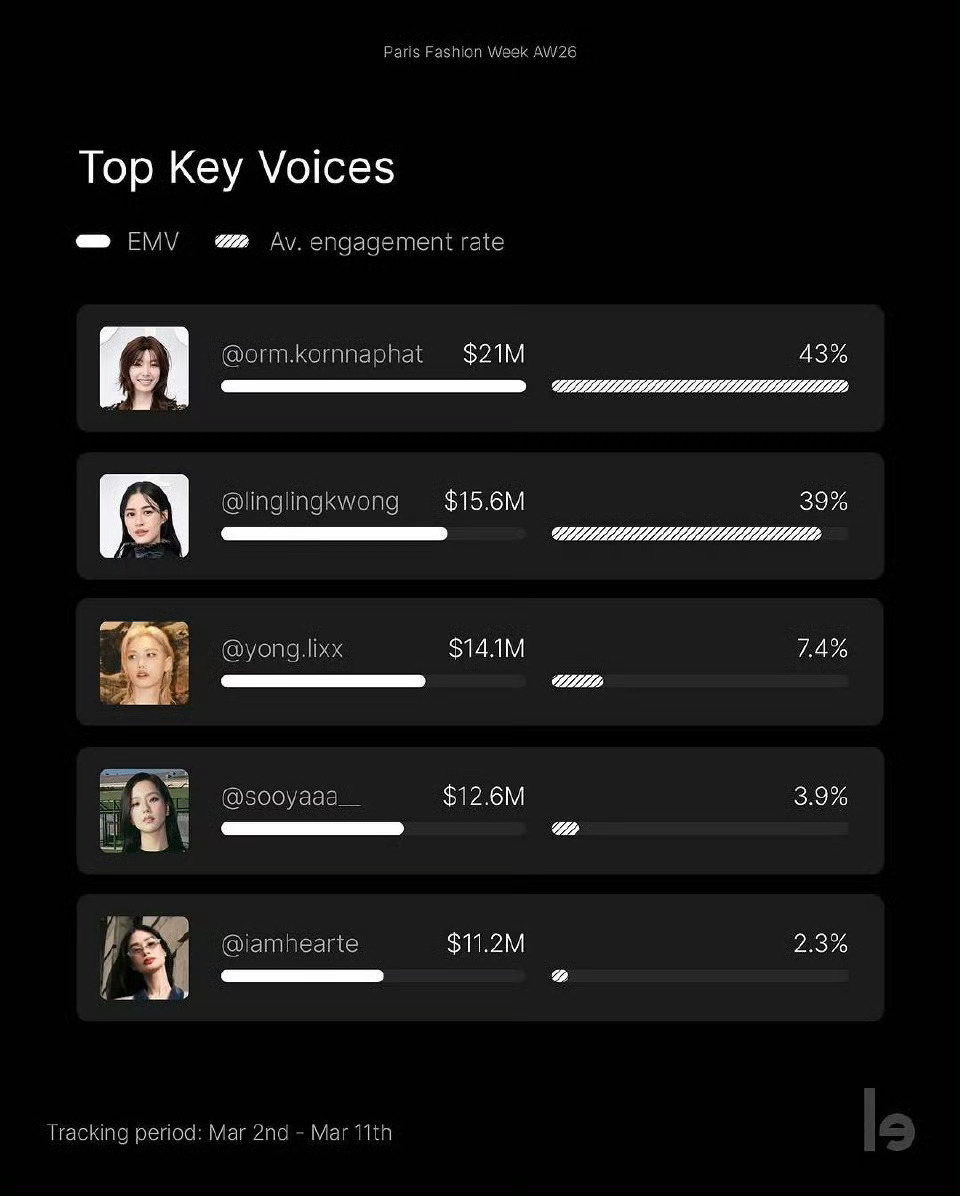 felix李龙馥在2026秋冬巴黎时装周上创造了Kpop艺人及男明星中的最高EMV(媒体曝光价值1410w美元),男明星最高排名,也是Kpop艺人最高排名📈