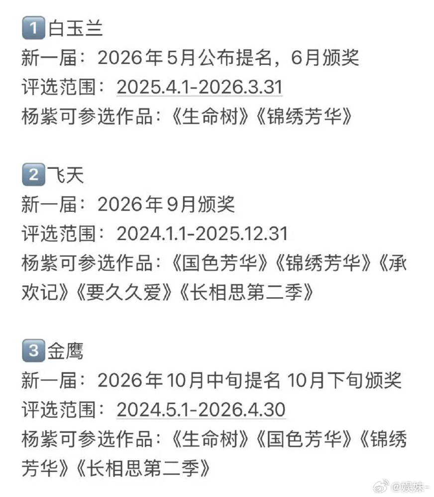 生命树白玉兰和金鹰肯定至少能拿一个,白玉兰去年宋佳就是山花烂漫拿的,从题材上来说生命树更加可贵,而且杨紫演的年纪跨度挺大的,演的很好,台词什么都很好,其实还是很看好白玉兰的,虽然推测的有三位入围的前辈竞争肯定很激烈