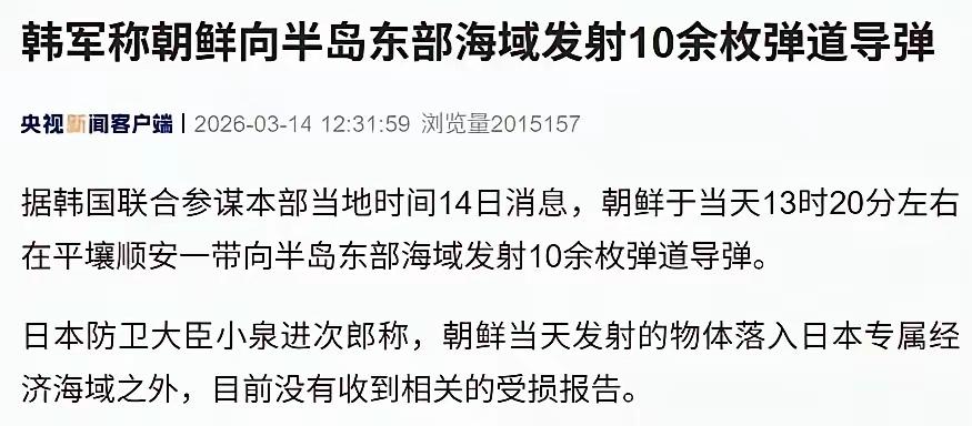 据韩国官方消息,平壤顺安地区于2026年3月13日下午1时20分,一口气向东海方向发射逾十枚弹道导弹。 这一动向迅速引发韩日两国高度戒备。截止当日晚间,韩国军方持续追踪导弹轨迹,确认落点均位于日本海,并未进入日本专属经济区。目前日本方面未发现任何损失或影响。 这批导弹为何突然密集发射?时间节点值得关注——就在上周,日本防卫省刚于3月6日至8日秘密完成新型地对地导弹部署,武器型号最高射程达1000公里,坐落在熊本市。该地距中国东南沿海直线距离不足900公里。 此次部署针对性极高,不仅形同对朝鲜半岛施加压力,更首次具备对中国沿海军事中心进行威慑的能力。 外界普遍认为,这属于日本近年来不断强化“西南岛屿战略”,防务布局由守转攻,区域安全态势剧烈变化。 平壤在日本地面导弹部署刚落地后迅速反应,选择以多枚弹道武器进行实弹发射,且方向明显指向日本海。 如此大规模且集中发射,极罕见。过去类似事件多为单枚试射或技术验证,这次10余枚齐发,被普遍解读为对日本新部署行为的直接回应。无论是在美国盟友体系下的日韩还是整个东北亚,导弹对抗升级迹象已非常清晰。 日本防卫大臣小泉进次郎在14日上午紧急通报,强调所有导弹均未落入日本专属区域内,全国各地暂无人员伤亡和财产损失报告。他同时呼吁民众保持冷静,日本会持续与韩国方面协调分析后续情况。 目前东京并未透露更多外交或军事反馈。韩国媒体则将重点放在导弹型号和飞行高度,有情报指出这次使用为短程弹道系列,但具体参数还有待进一步核查。 各方信息汇总,导弹发射与日本新武器部署的时间几乎无缝衔接。熊本成为敏感节点,既扼守西南岛链,也能覆盖中国、日本多地。 日本近期加强导弹布局原因,部分是应对中方频繁军事演习,同时也考虑中国海上力量增强带来的压力。美国在幕后提供技术和情报支持,形成三角安全结构。 此次事件也折射出东北亚安全格局短期剧烈变化。多个国家因应彼此举措,出现不同程度的军事警示和“展示肌肉”。 对于亚洲普通民众而言,每一次导弹起飞都意味着风险提升;对于投资者、大型机构,则须重新评估日韩市场的地缘因素。日本国内有声音质疑,新导弹部署是否合理,防卫应否扩大边界。 韩国则呼吁各方克制,避免刺激区域局势进一步紧张。中国外交部截至目前尚未发表正式声明,保持观望态度。 回到实际,导弹试射背后蕴含的是各国对安全战略调整的即时反应。以往可能需要数月磋商,这次却以天为单位迅速“对表”。 多枚弹道导弹齐发,既是一种常规军事操作,也是对对手行动的信号,再配合地面部署和舆论渲染,东北亚地区未来数月不排除有进一步动态出现。 对于头条读者来说,这波突发事件提供了最新地缘情报和背景复盘。日本熊本新部署导弹、朝鲜顺安地区密集发射、韩国追踪监测、国际社会静观其变,都是本轮事件不可忽视的细节。每一次边境武装升级,都值得所有关心“安全、经济、环境”的人持续观察。 谁能掌握主动权,谁又会应对突发压力?东北亚下一步怎么走,仍需严密关注新一轮动态。