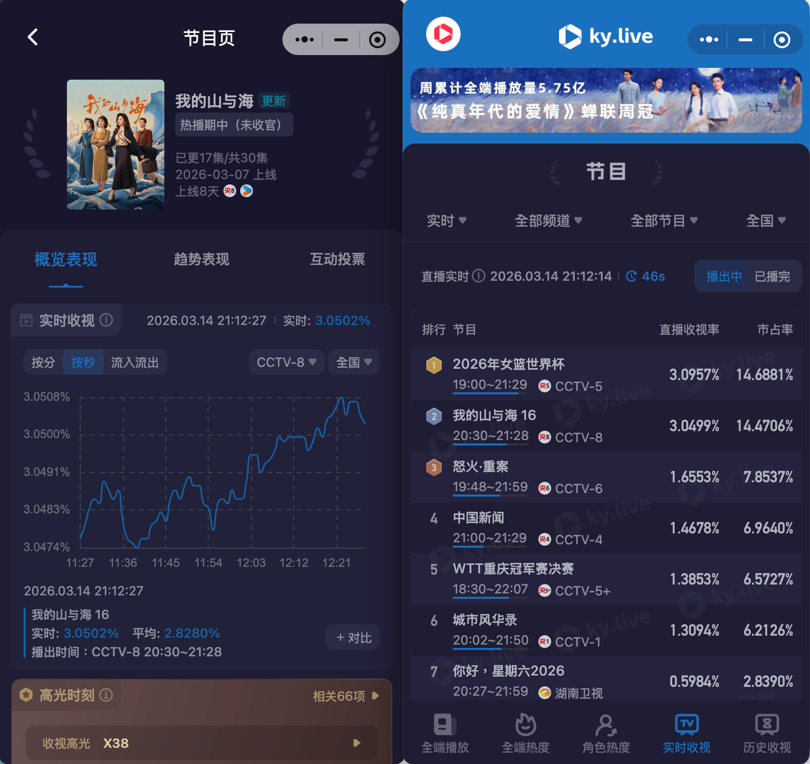谭松韵谭松韵我的山与海收视破3一开始很多人都不看好,说题材冷,说节奏慢,说破3很难。可偏偏它就是一点一点往上走,从2.7到2.8,再到3,最后冲到3.0508。不是一夜爆红,是稳稳地涨,是观众自己用遥控器投票。大家都不看好,偏偏它最争气,这种感觉真的很爽。谭松韵我的山与海收视破3 谭松韵