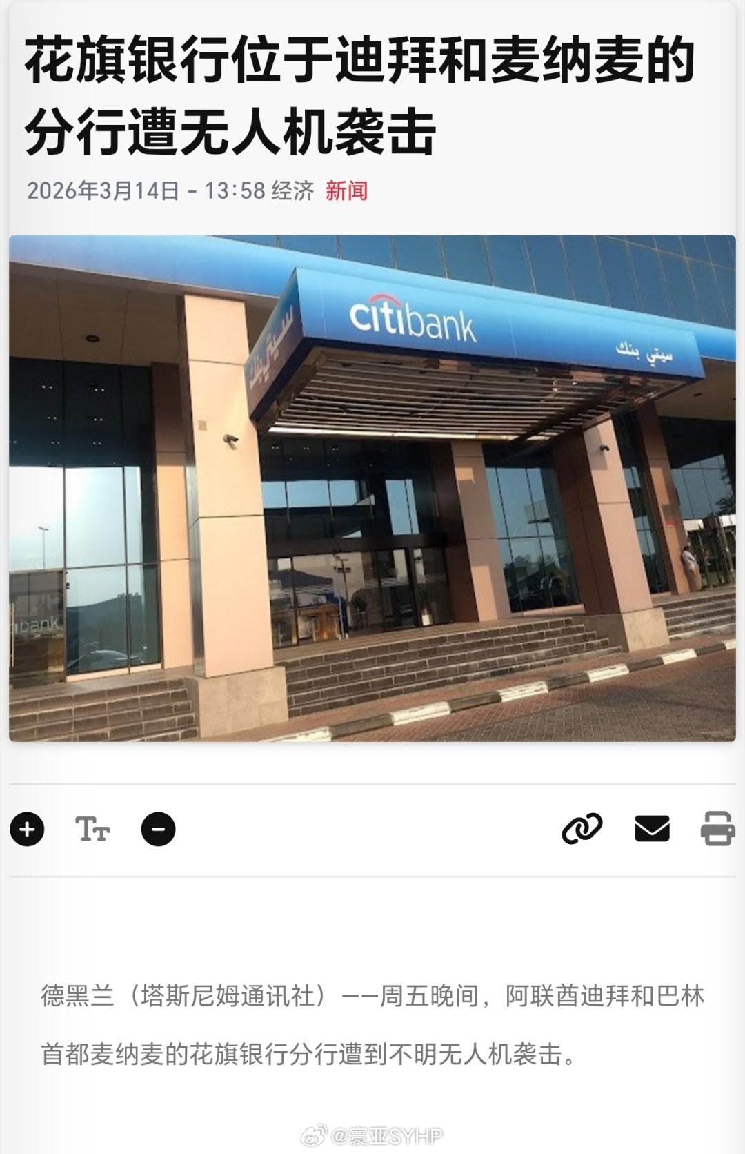 伊朗袭击美国花旗银行分支机构伊朗革命卫队称,用无人机袭击了阿联酋迪拜和巴林麦纳麦的美国花旗银行分行,以回应以色列/美国袭击德黑兰一家“塞帕赫”银行。