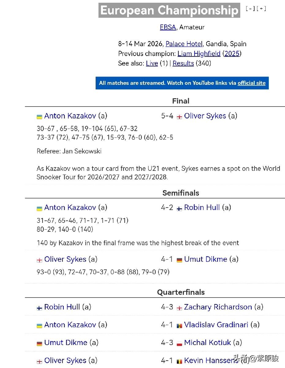 安东·卡扎科夫5-4逆转奥利弗·赛克斯,获得欧洲锦标赛冠军,这是卡扎科夫时隔几天后获得的第二个冠军,此前他在欧洲21岁以下锦标赛中夺冠,并重返职业。赛克斯虽然获得亚军,但也拿到了职业资格。 在西班牙甘迪亚进行的欧洲斯诺克锦标赛今天凌晨收官,继几天前获得欧洲21岁以下锦标赛冠军后,卡扎科夫在决赛中5-4逆转英格兰选手奥利弗·赛克斯,再夺冠军。 确实了不起,连续两站比赛,每站参赛球员都在200人左右,并从中突围拿到冠军,乌克兰选手安东·卡扎科夫做到了。 欧洲锦标赛和欧洲21岁以下锦标赛各有一个斯诺克巡回赛职业名额,没想到这两项赛事的冠军被卡扎科夫一人包揽。按照规则,欧洲锦标赛亚军奥利弗·赛克斯获得了一个职业名额。