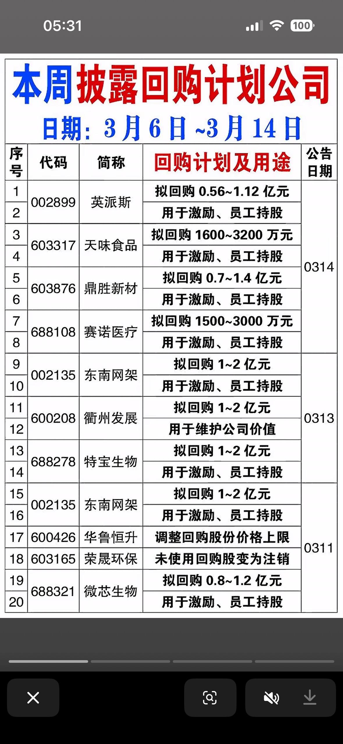 3月14日本周披露回购计划的公司可不少。 这背后都藏着各自的“小算盘”。有些公司回购是为了稳定股价,向市场传递积极信号,让投资者心里踏实。比如有的公司股价近期波动较大,通过回购能给股价来一针“强心剂”。还有些公司回购是为了激励员工,把回购的股票用于员工持股计划,让员工更有干劲。不过,也得警惕有些公司只是做做样子,打着回购的旗号,实际没什么实质性动作。对于投资者来说,得仔细研究这些披露回购计划的公司,别被表象迷惑,要透过现象看本质,才能在投资中少走弯路。