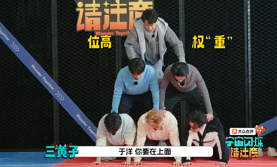 于洋真是只有一张嘴,一动真格的他就拈轻怕重还说要打黄晓明,因为黄晓明整他脊椎了,怪不得黄子韬都吐槽他既没有承重的能力,体重还大,纯粹的拖油瓶! 在爆闪团的终极挑战中,导演让兄弟们六人一体,组成金字塔的形状,快速的爬过跑道,并让节目组的小绿人为他们做了示范。 看到这一幕大家都知道最累的肯定是最下面的三个人。 而体重最大的于洋和两个大小牤牛黄子韬、邵子恒是最下面的三个人,而黄晓明和刘耀文是中间的两个人,体重最轻的王鹤棣就是金字塔最上面的那个人。 一开始于洋认为两边吃力,中间的人稍微轻松点,他就让黄子韬和邵子恒在边上,试过后发现中间的更吃力,马上叫黄子韬宝贝,要求就换位置。 黄晓明的一条腿在于洋身上,一条腿在黄子韬身上。于洋大呼小叫的喊着黄晓明如果再整他的脊椎他就要打黄晓明。 大家没有办法就让于洋和黄晓明换了位置,于洋站打了黄晓明的身上。结果他还是大呼小叫的喊着他的腿劈了。 黄子韬气得只朝节目要刀,吐槽于洋是纯粹的拖油瓶,下面不行,上面也不行,没有承重的能力,体重还大。 兄弟们只好又让王鹤棣和于洋换了位置,于洋站在了最上层。他一手掐着王鹤棣的脖子,一手搂着刘耀文的脖子,又把他俩给直接拖了下去。 最后因为于洋的关系,兄弟们这个游戏挑战还是失败了!