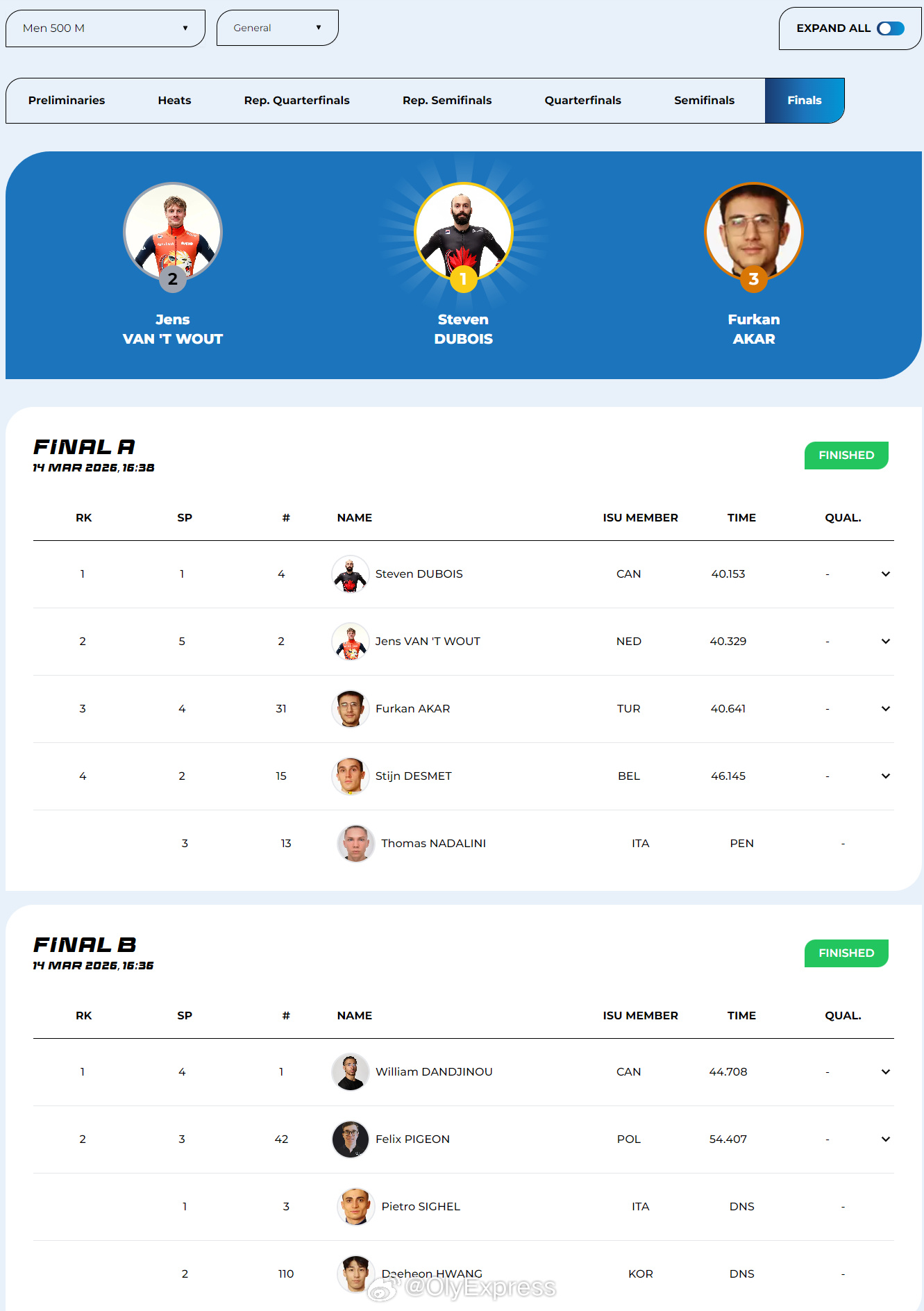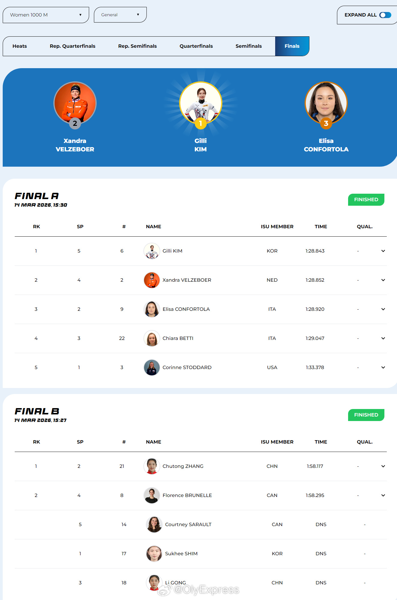 【短道速滑世锦赛中国女子接力摘铜 韩国两金】2026年短道速滑世锦赛 3月14日加拿大蒙特利尔,2026年短道速滑世锦赛产生四枚金牌,韩国夺得两金,中国获得女子接力铜牌。在女子3000米接力决赛中,由王晔、公俐、张楚桐和王欣然组成的中国队以4分11秒185获得铜牌,荷兰和意大利分获金银牌。韩国林钟彦和金桔里分获男子1500米和女子1000米冠军,中国队张柏浩排名男子B组第三,张楚桐和公俐分列女子B组第一和第六。加拿大杜博瓦夺得男子500米冠军,荷兰范特乌特和土耳其阿卡尔分获银铜牌。中国队无人进入决赛。此外,中国男队进入5000米接力A组决赛,混团半决赛犯规无缘争冠。