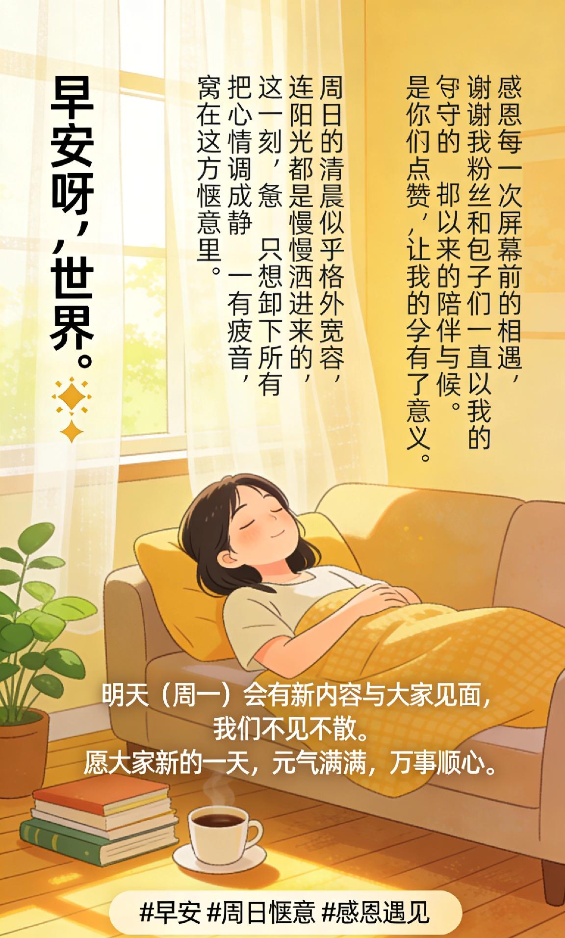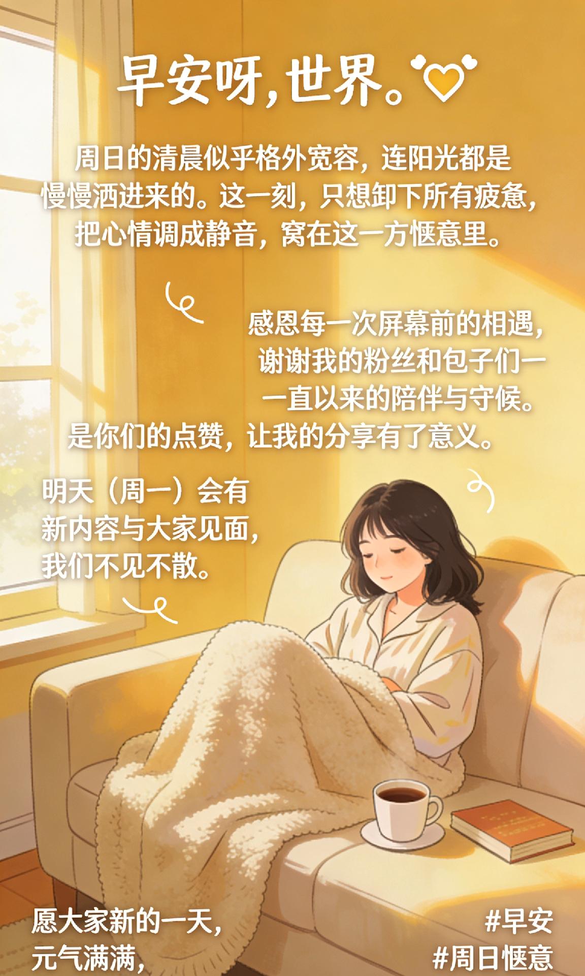 早安呀,世界。☀️ 周日的清晨似乎格外宽容,连阳光都是慢慢洒进来的。 这一刻,只想卸下所有疲惫,把心情调成静音,窝在这一方惬意里。 感恩每一次屏幕前的相遇,谢谢我的粉丝和包子们一直以来的陪伴与守候。 是你们的点赞,让我的分享有了意义。 明天(周一)会有新内容与大家见面,我们不见不散。 愿大家新的一天,元气满满,万事顺心。 早安 周日惬意