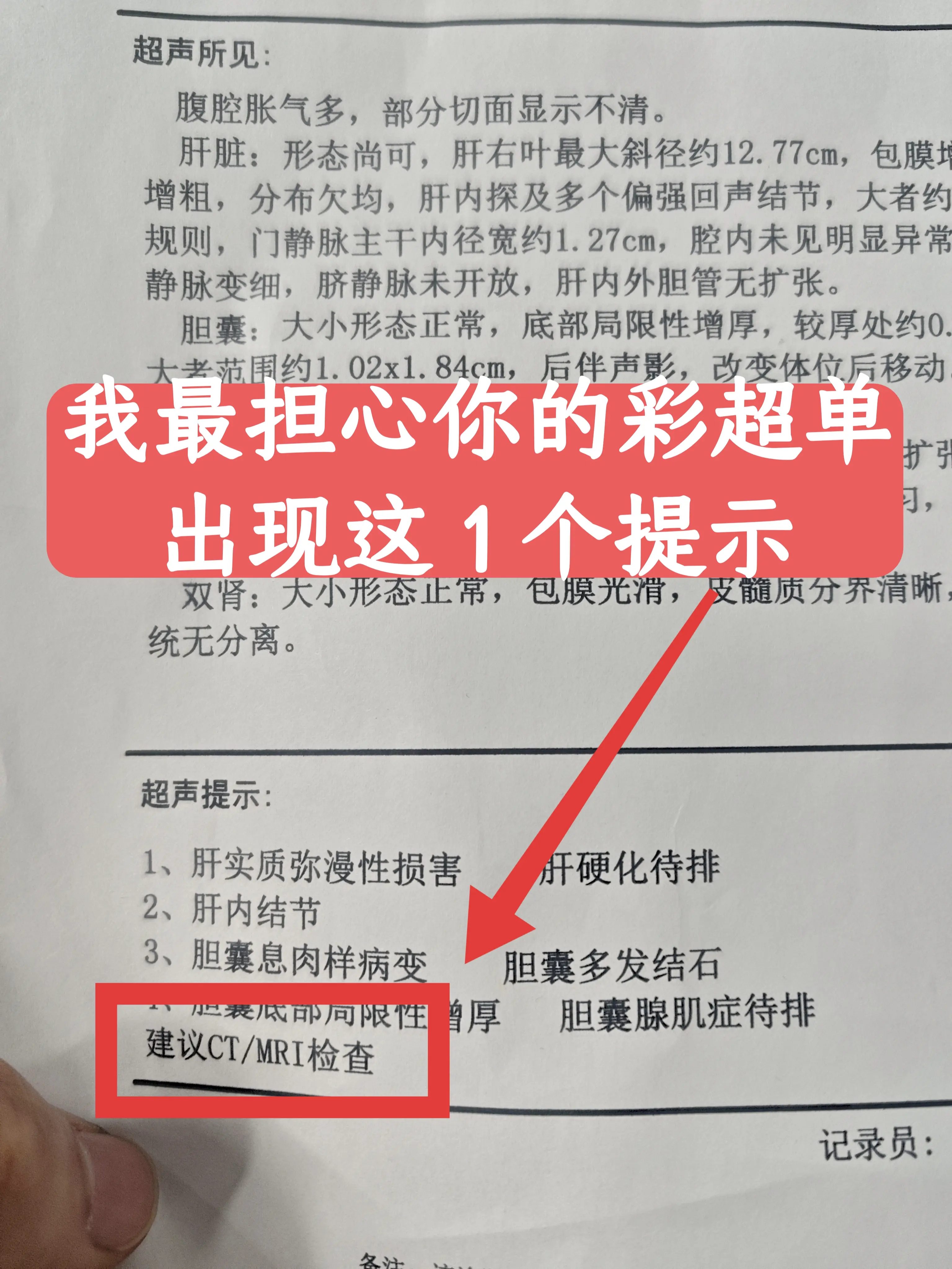 说实话,干肝病医生 30 来年,患者如果查出乙肝、肝纤维化、肝硬化,我不是特担心,因为我知道有好办法控制,但我就担心你的彩超上,突然出现这 1 个提示:建议 CT/MRI 检查!