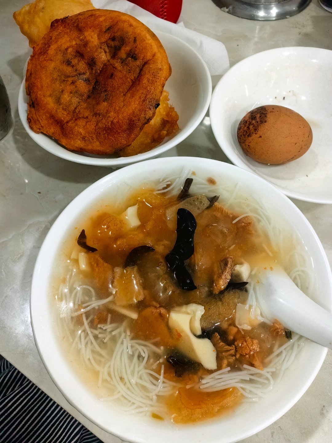 *在路上*自驾游第26天...花竹日出后,赶到镇上吃早点...面线糊+酸辣汤=糊汤,暖和。圆圆的油饼,里面有两只小虾。长的叫粉干饼,里面有面线。大包子=肉丁+梅干菜+七七八八。嗯,我现在对微甜已经适应了,挺好吃...福建宁德霞浦... 宁德·金沙街