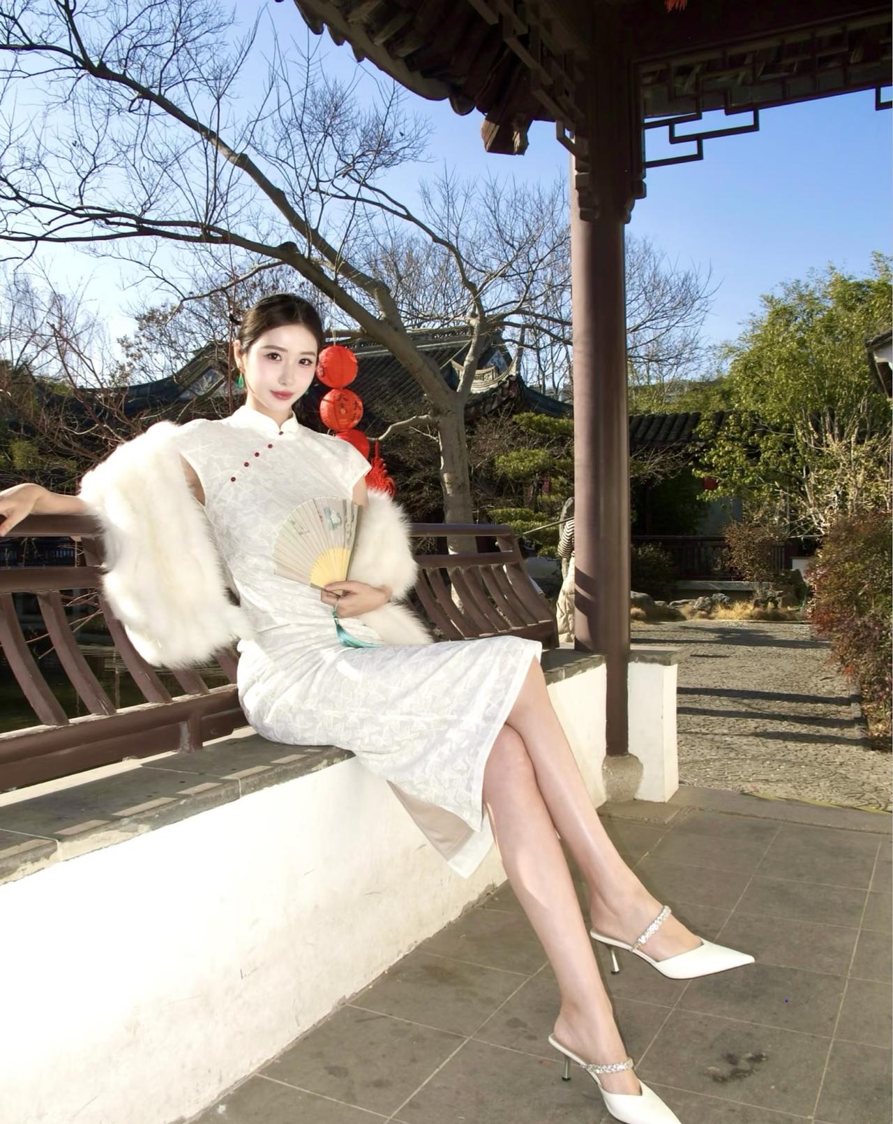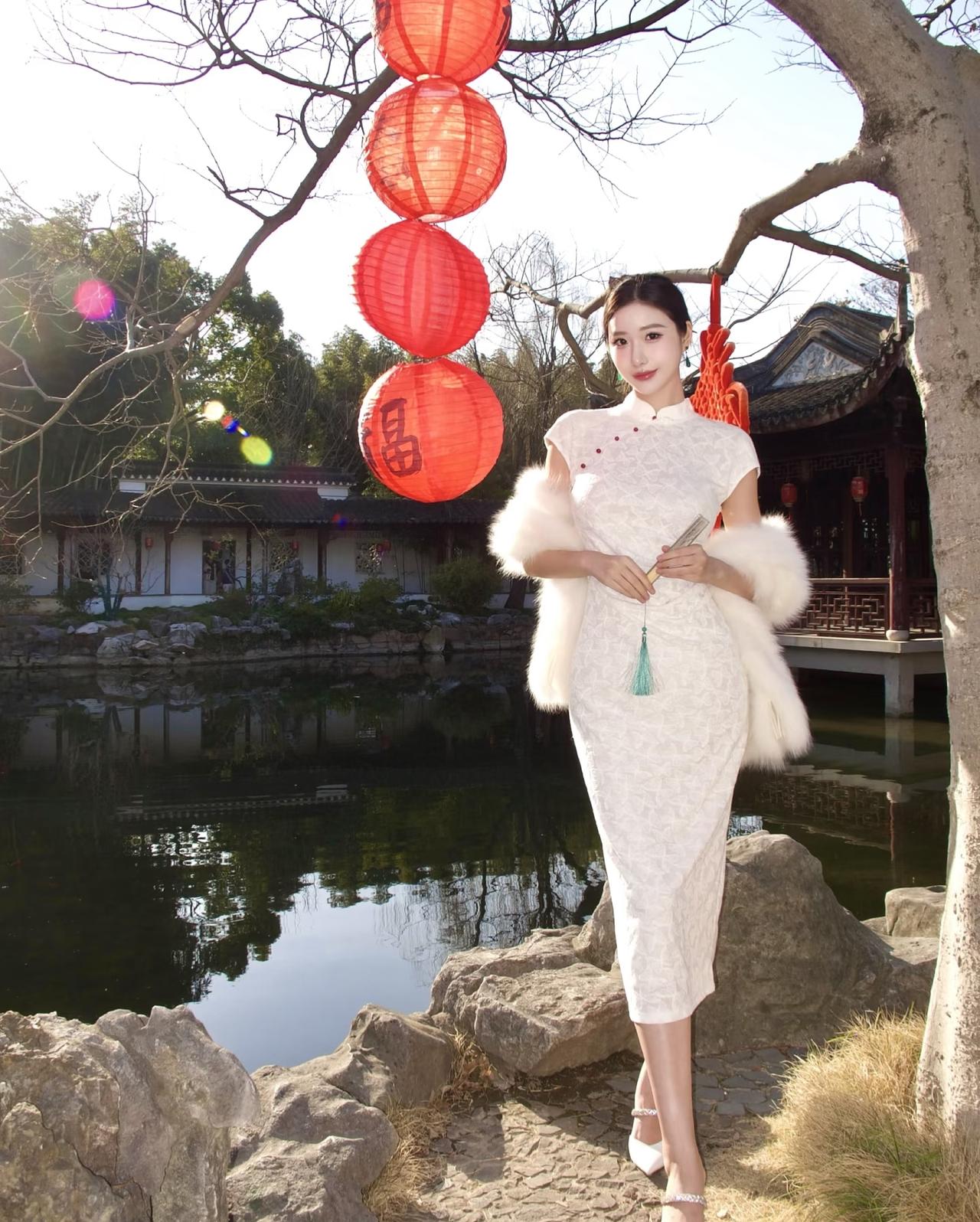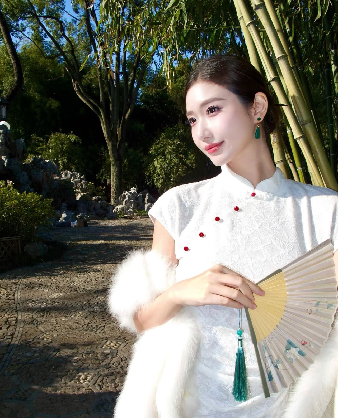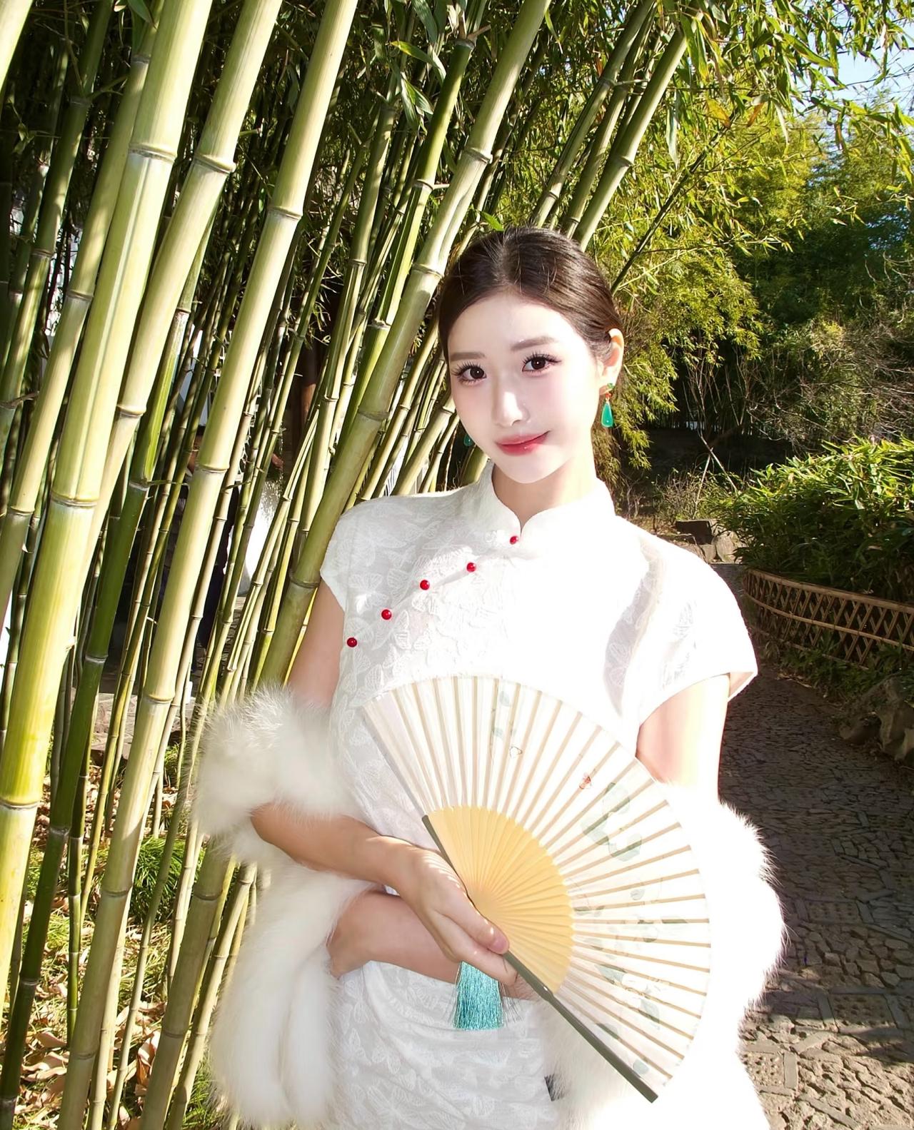 她执一把素色纸扇,鬓边别着朵粉樱,眉眼温婉如春水。湖面倒映着白墙黛瓦,也映着她亭亭的身影。偶尔抬手拂过垂落的发丝,玉镯轻响,惊起檐下的春燕。 不必浓妆,不必艳饰。这抹倩影,便和满城春色相融,成了江南春日里最动人的一笔。