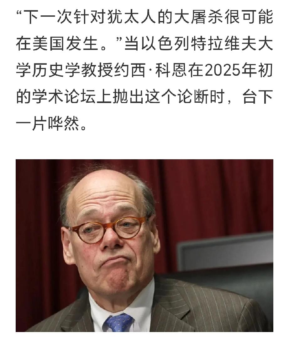 以色列历史学教授约西·科恩在2025年说的“下一个屠杀犹太人的地方,极有可能是美国”这段话,被当下的美以伊战争翻了出来。 这个教授的逻辑推理应该是他深刻地意识到,终有一天,犹太人会让美国为了捍卫犹太人的贪、恶、自私和残暴把综合国力耗光,最后导致美国的霸权的终结,而美国人也终将意识到,是犹太人用阴险和狡诈成功控制住了美国,并最终让美国付出失去霸权沦为二流国家的代价,其代价远比到现在为止被美国所认定的所有的邪恶国家给美国造成的损害的总和还要多得多。 这个以色列教授意识到,到那时,彻底认清是犹太人害了美国的美国人只有通过屠杀犹太人才能一解心头之恨的事就会发生,这个逻辑是成立的,他现在开始为此感到忧心忡忡是正常的。