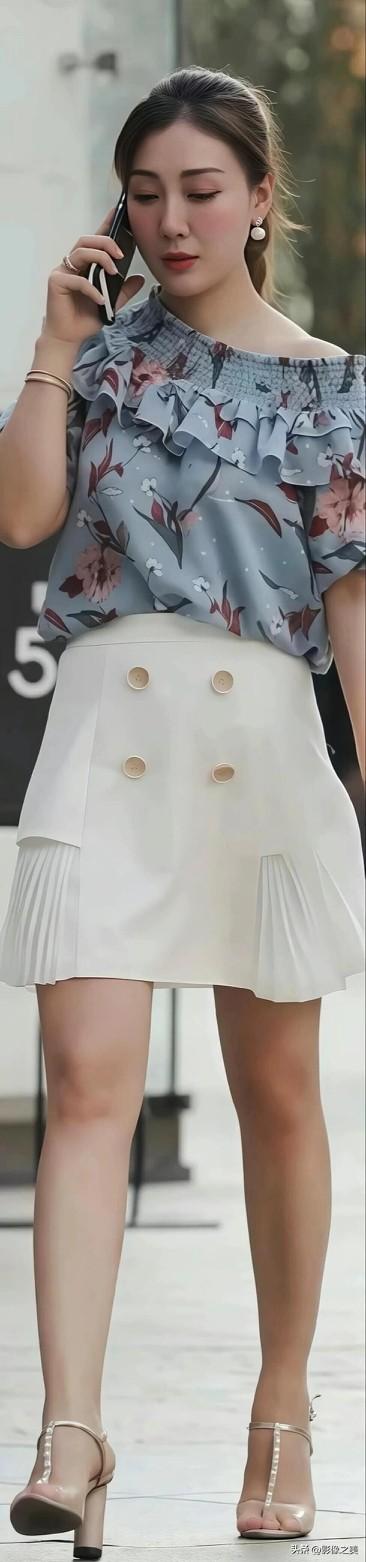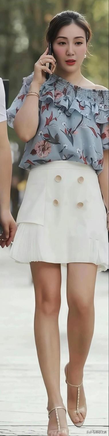 浅蓝碎花衫搭配白色百褶短裙,温柔又清爽,高跟凉鞋衬得身姿挺拔,通勤或约会都很合适。
