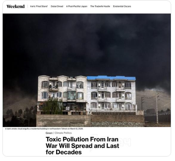【美国对伊朗的空袭所造成的环境后果将持续数十年——彭博社】原因是导弹和炮弹中含有重金属和其他有害物质,会污染空气、水和土壤。 污染可能会扩散到该地区以外的地区。 最严重的事件是袭击德黑兰附近的石油储存设施。