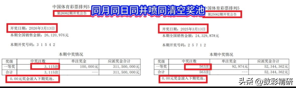 排列五连续两期奖池被“掏空”,是福是祸? 排列五在连续两期中掏空奖池,表面看是彩市盛事,背后却可能潜藏隐忧。 其一,巧合之疑,动摇信任根基。 对许多彩民而言,如此巧合难免引人遐想:天底下真有这般巧事?2025年062期与2026年062期,不仅同为3月13日开奖,更皆以清空奖池告终;紧接着2026年063期(3月14日)竟再度“归零”。这般接连的“巧合”,当作何解? 其二,前车之鉴,恐将触发规则之变。 历史经验表明,每当大奖出现异常,规则往往随之调整。例如,江西曾现“10万中2.2亿且免税”之例,而今规则已改为单注奖金过万即需纳税;贵州6.9亿历史巨奖诞生后,更直接催生了“头奖总奖金不超一亿”的封顶规则,使得双色球、大乐透、快乐8等玩法,再难现一人独揽数亿奖金的景象。此番排列五连续清空奖池,很可能步此后尘——规则或将修改,对总奖金设置上限。 其三,热情难续,恐损市场健康。 短期看,奖池“归零”的新闻或能点燃购彩热情,吸引更多参与。然而,奖池枯竭后,后续中奖金额势必大幅缩水,长远将挫伤彩民期待与信心。更值得警惕的是,这种高频、井喷式开奖,易诱发投机心理,助推非理性倍投,加剧购彩风险。 这一现象犹如一记警钟,提醒市场管理者:不仅要坚守“公开、公平、公正”的生命线,更需着眼长远,通过优化规则设计、稳定奖池水位、倡导理性购彩,方能护航彩票行业行稳致远,实现健康发展。