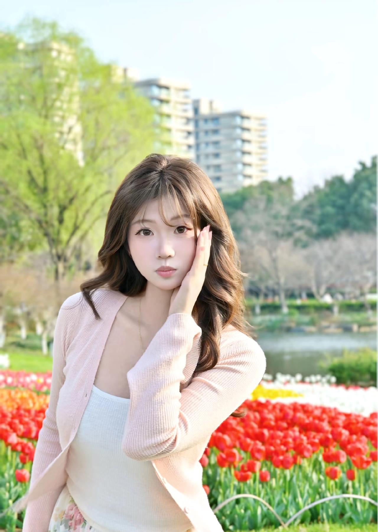 她执一把素色纸扇,鬓边别着朵粉樱,眉眼温婉如春水。湖面倒映着白墙黛瓦,也映着她亭