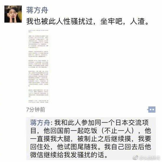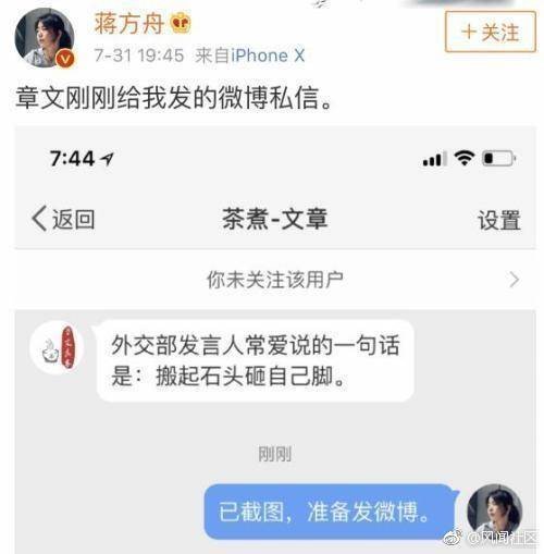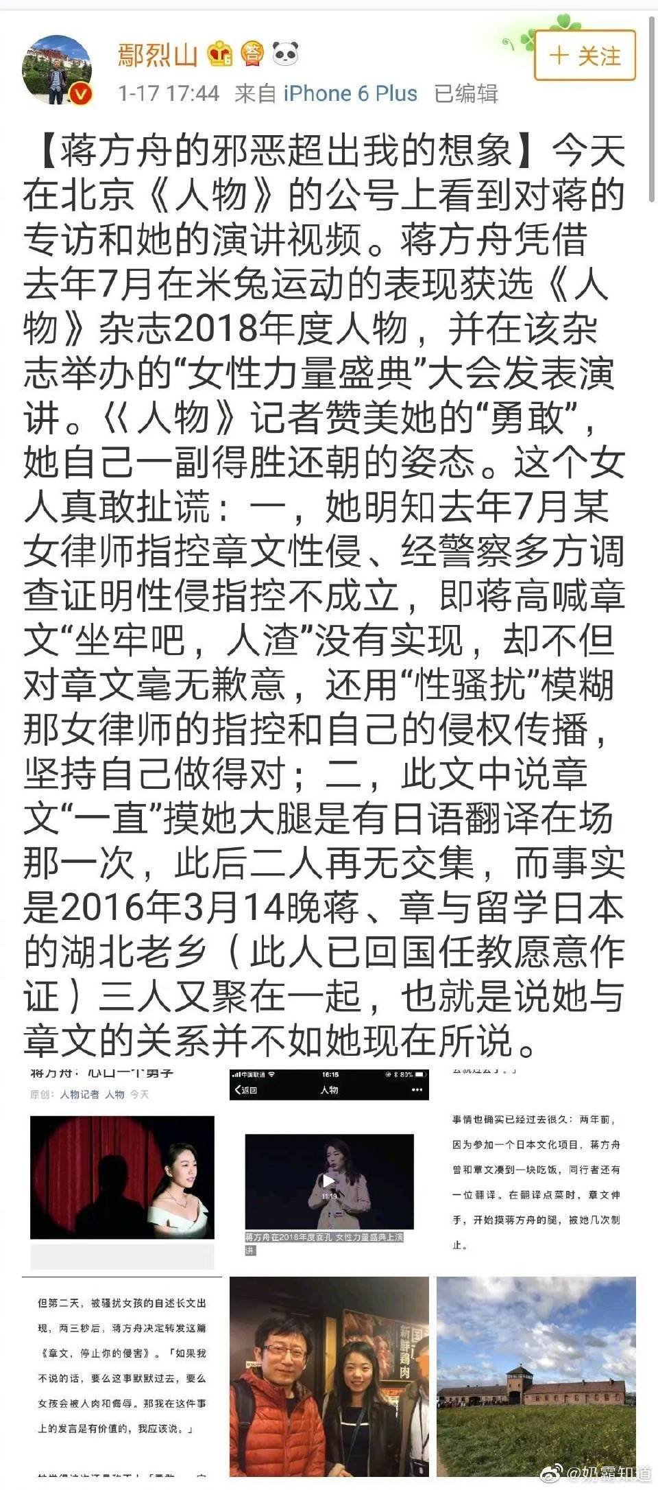 后来,章文、孙冕等人的性骚扰事件都没有了下文。章文事件热度几乎没有了。章文摇身一变开始指责朱军。有一回给蒋方舟发了威胁的私信,蒋方舟挂了出来,但是这件事也没太大水花。