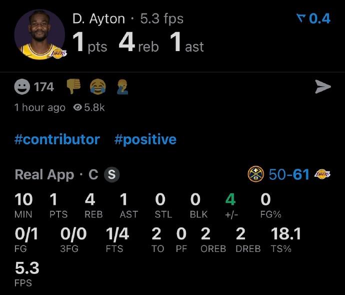 艾顿这数据:半场1分! 上一次打掘金,艾顿只打了4分39秒,没有得分进账,拿到2个篮板球。 这一场看样子又萎靡不振了,上半场至少有3次篮下2+1的机会,最后各种掉球,被犯规去罚球,来个4罚1中,效率太低了。 这个状态,湖人只能期待季后赛别遇着掘金了,要不然就是海斯顶5或者五小阵容,约基奇想怎么打就怎么打...