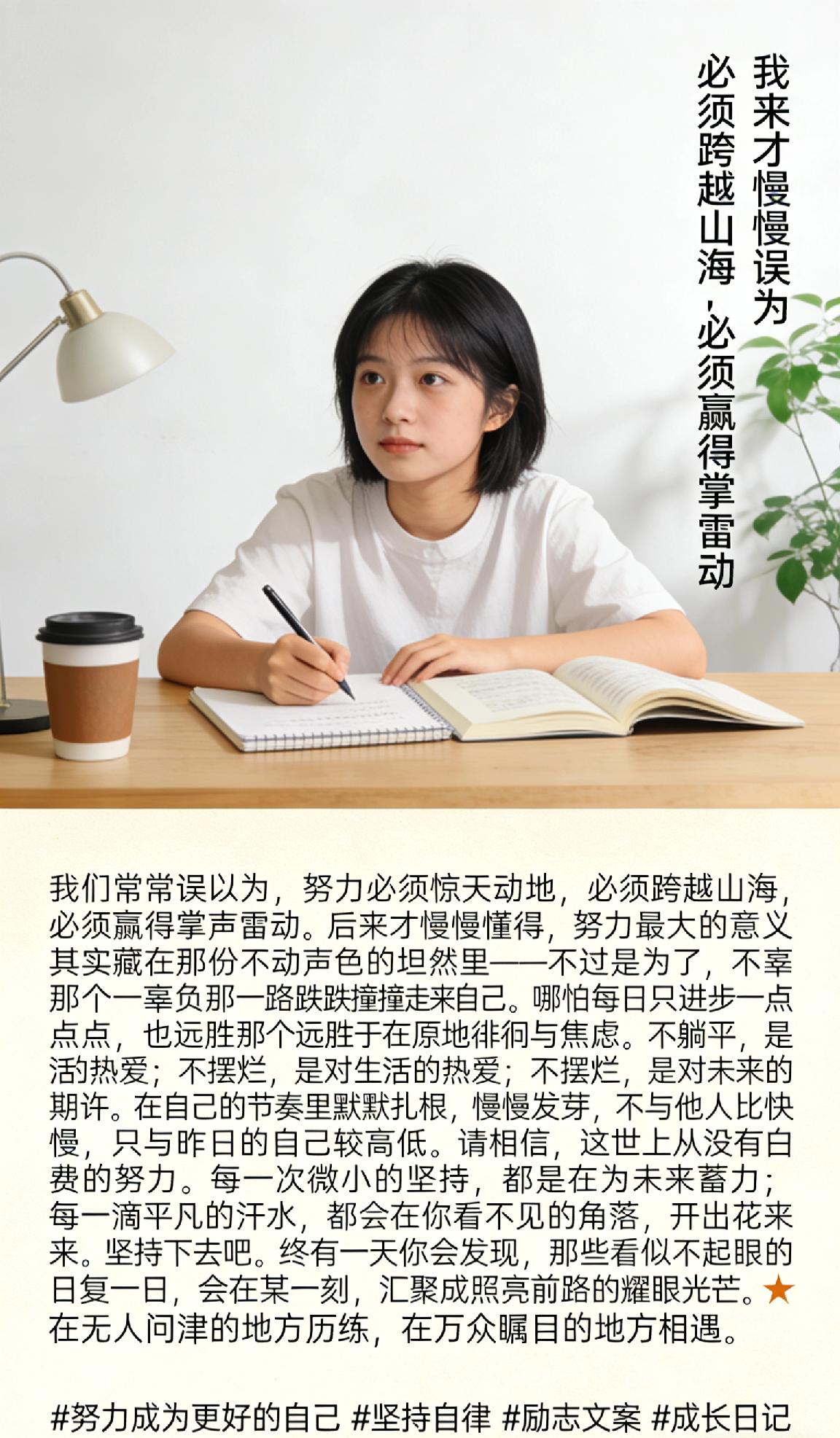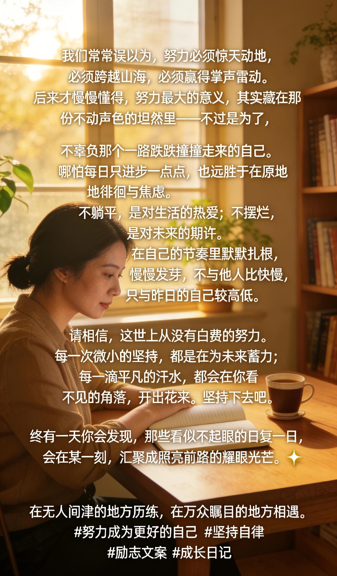 【不必追赶光,你也是自己的星辰】我们常常误以为,努力必须惊天动地, 必须跨越山海,必须赢得掌声雷动。 后来才慢慢懂得, 努力最大的意义,其实藏在那份不动声色的坦然里—— 不过是为了,不辜负那个一路跌跌撞撞走来的自己。 哪怕每日只进步一点点,也远胜于在原地徘徊与焦虑。 不躺平,是对生活的热爱; 不摆烂,是对未来的期许。 在自己的节奏里默默扎根,慢慢发芽, 不与他人比快慢,只与昨日的自己较高低。 请相信,这世上从没有白费的努力。 每一次微小的坚持,都是在为未来蓄力; 每一滴平凡的汗水,都会在你看不见的角落,开出花来。 坚持下去吧。 终有一天你会发现, 那些看似不起眼的日复一日, 会在某一刻,汇聚成照亮前路的耀眼光芒。 ✨ 在无人问津的地方历练,在万众瞩目的地方相遇。 努力成为更好的自己 坚持自律 励志文案