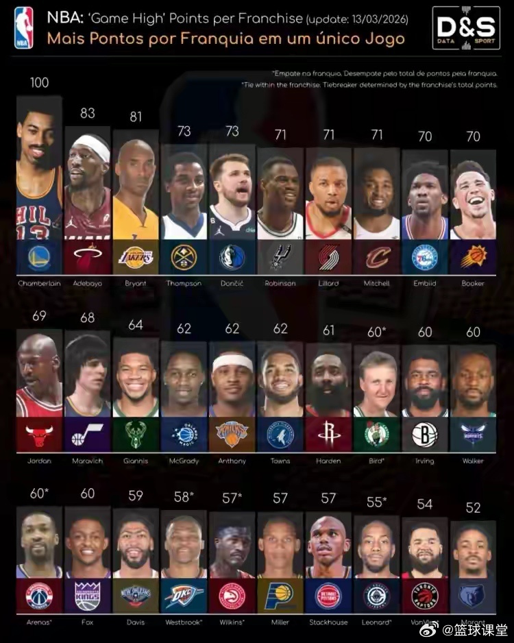 NBA各队队史单场得分王!