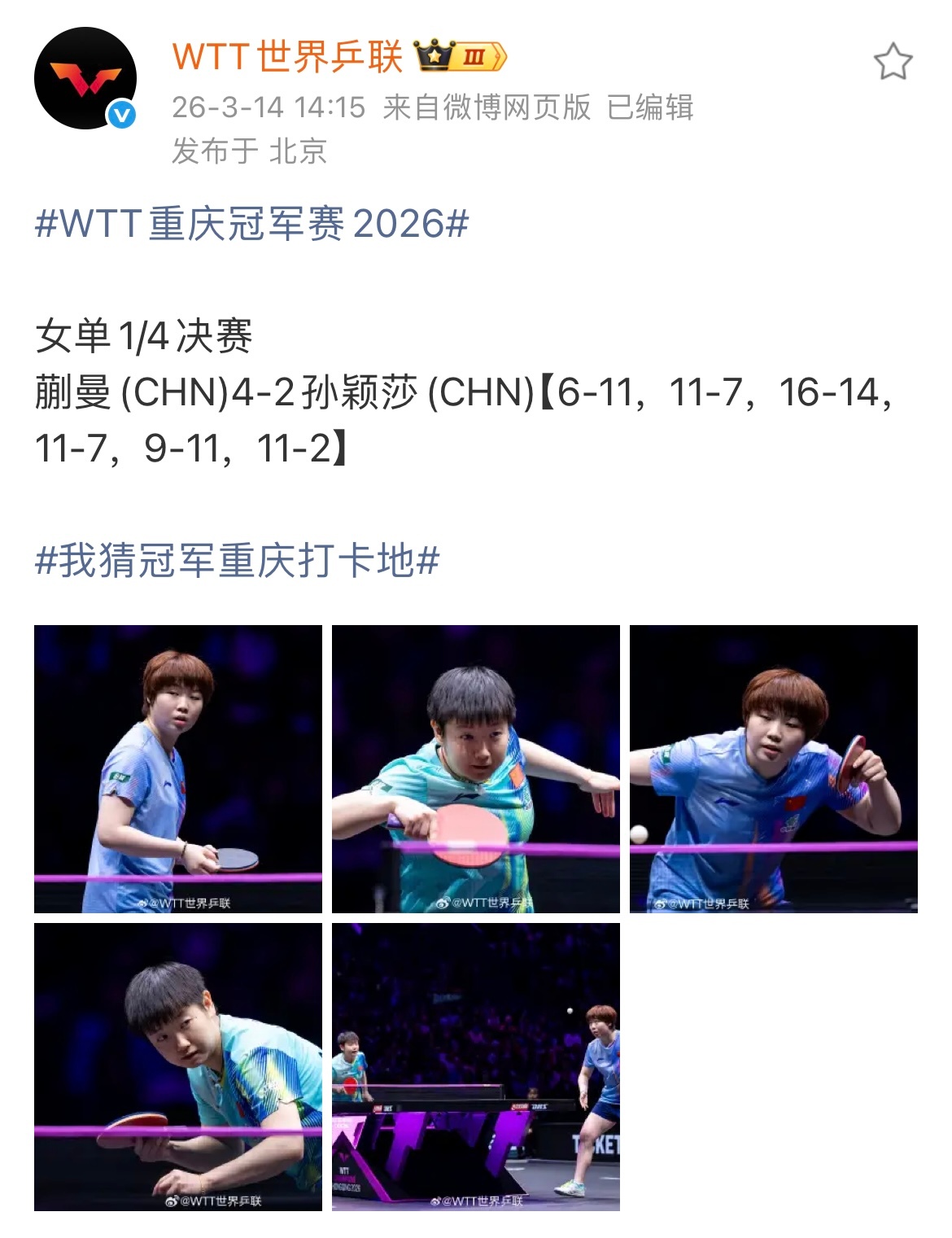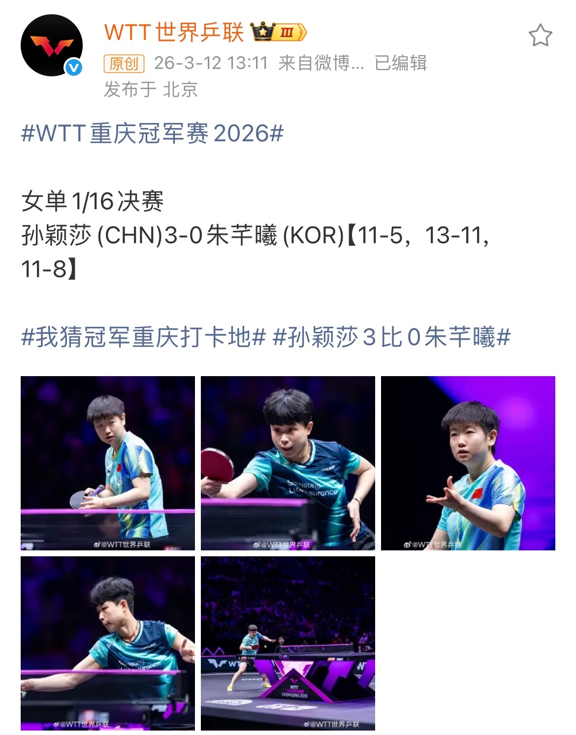 重庆冠军赛|孙颖莎 女单晋级之路