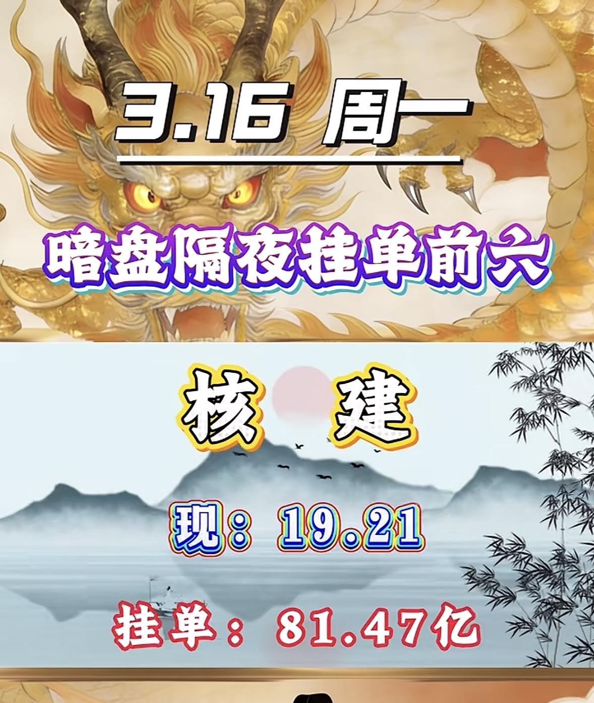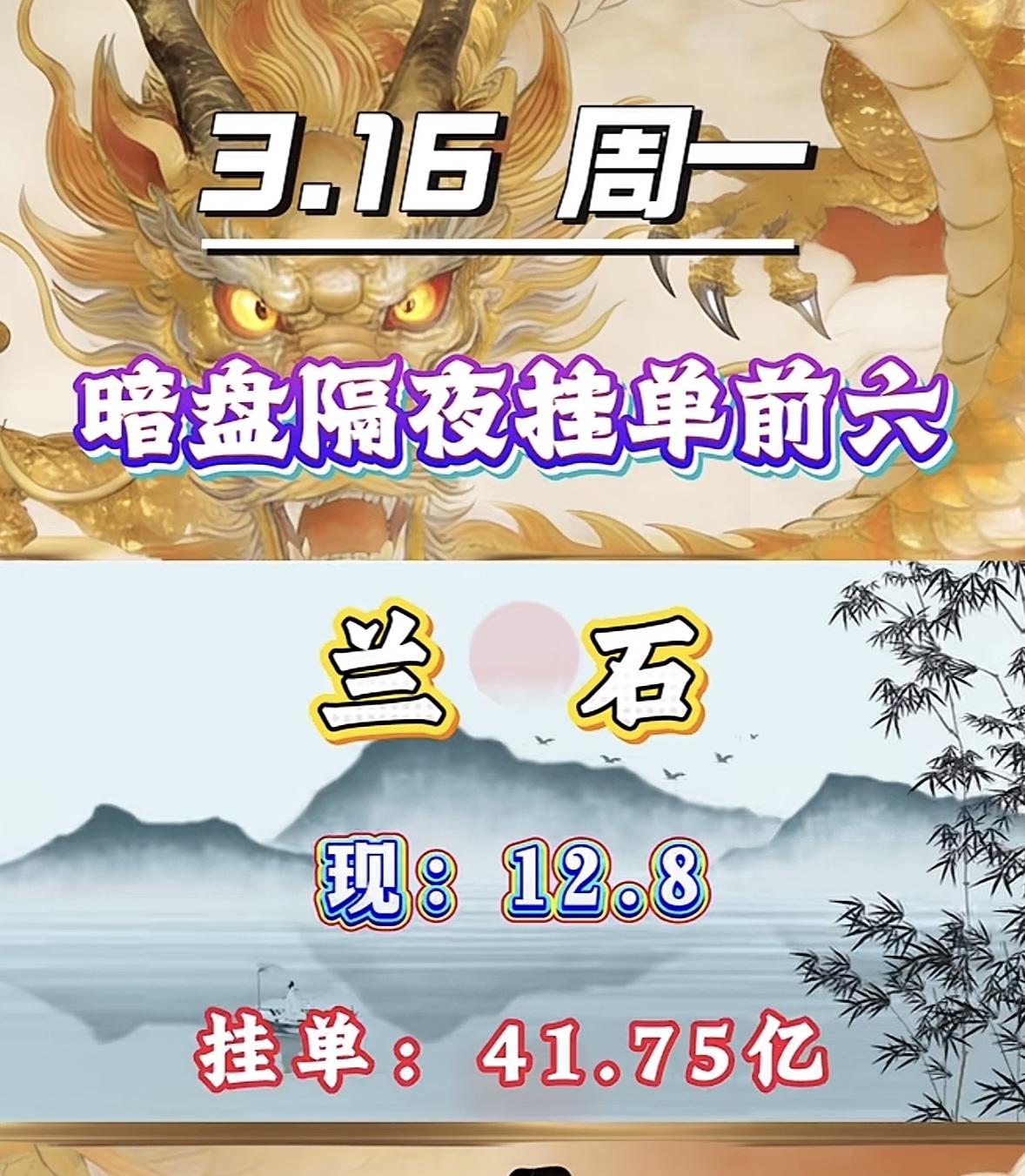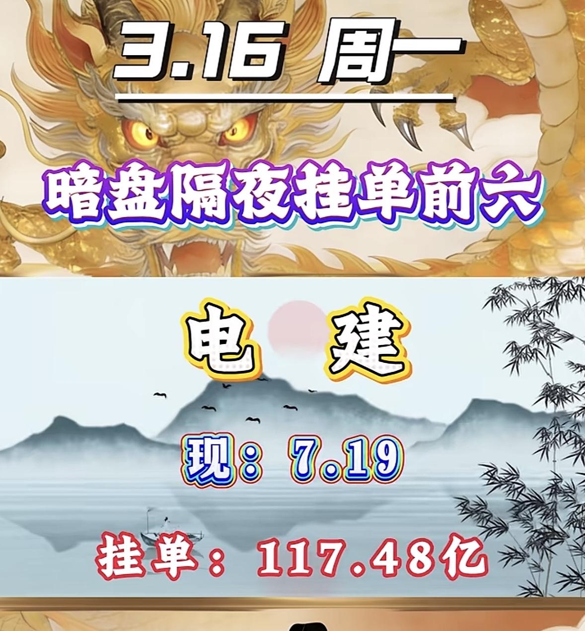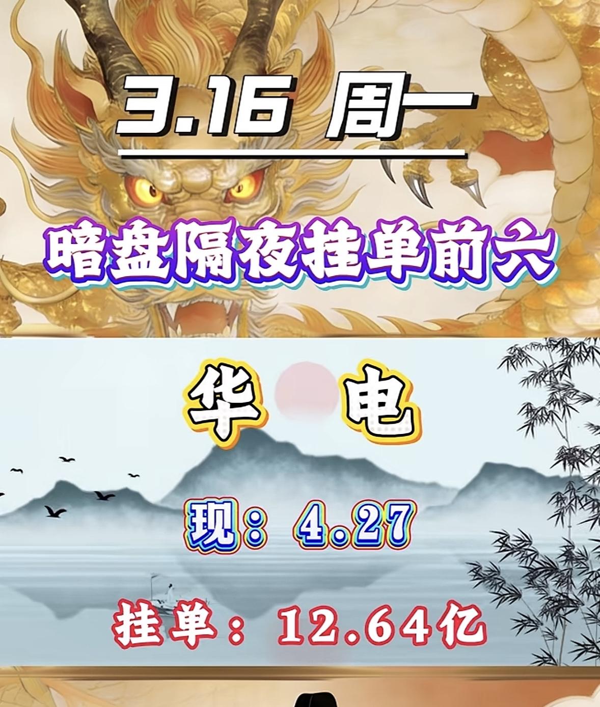 3月16日暗盘隔夜挂单个股揭晓 华电股票这次可是来势汹汹!3月16日暗盘隔夜挂单它排前六,现价4.27元,挂单金额高达12.64亿。想想其他获资金关注的个股,像岩山科技、金风科技等,都各有亮点。华电能源曾多次更名,从龙电股份到现在的华电能源,经历了不少变化。它能在暗盘挂单如此强势,背后肯定有资金看好它的潜力。也许是其在电力领域有独特优势,说不定未来会有不错的表现。不过股市变幻莫测,这只是目前的情况,后续如何还得持续关注。