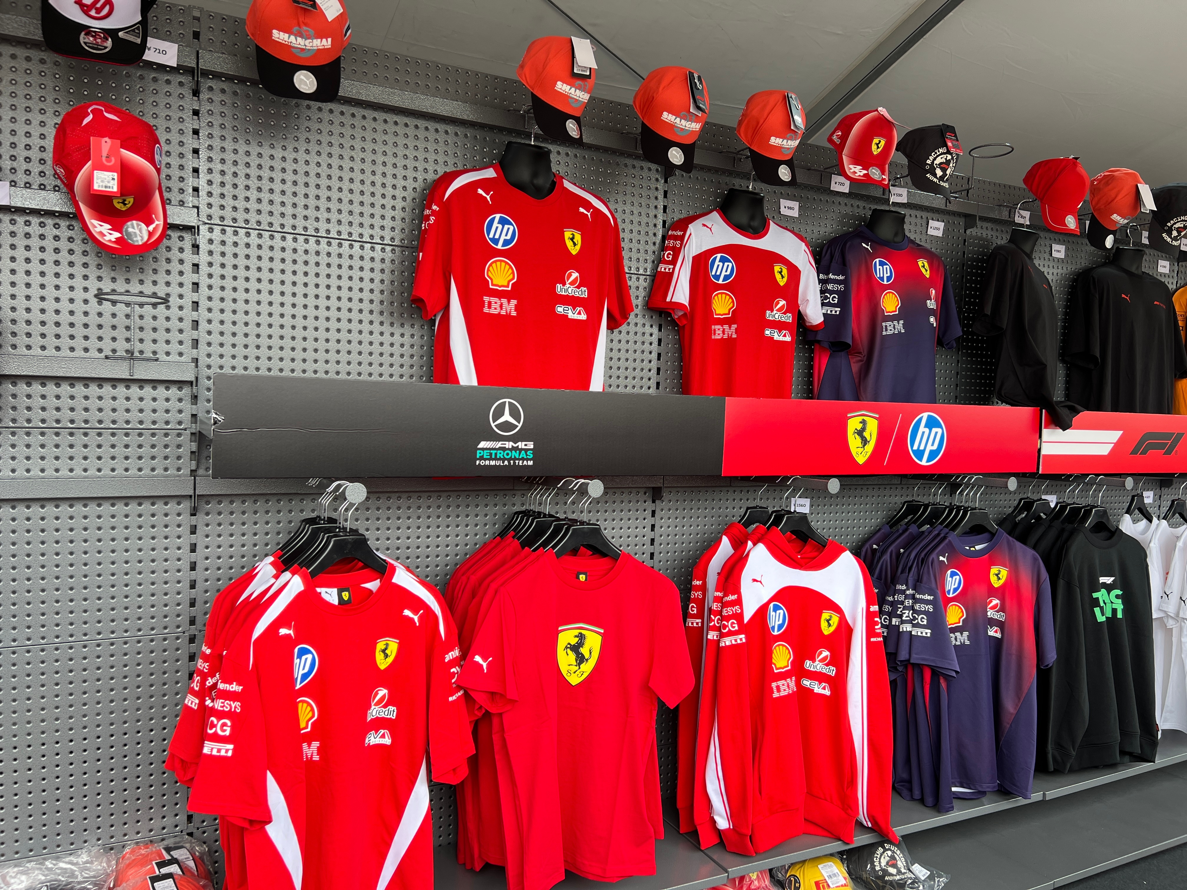 卖的最好的竟然不是法拉利的周边,而是红牛,第二天就全部售罄。还有一款奔驰的帽子,第一天上午就直接卖断货了。