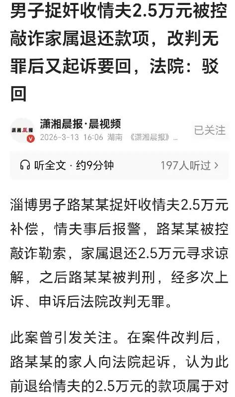 山东淄博,一个已婚女子利用送孩子上辅导班的时间,赶紧跟婚外的男子约了在楼下的酒店见面。于房间里正好被丈夫逮个正着,被抓后,跟妻子在一起的男子表示,愿意支付2.5万元赔偿。谁知道,男子后来又反咬一口,说被勒索了。女子的丈夫又被抓起来判了敲诈罪,后来丈夫坚持上诉,提供诸多证据后终于改判无罪。 淄博女子借送娃补课约会情人,丈夫捉奸收2.5万反获刑,申诉多年终改无罪 山东淄博发生一起荒诞又令人唏嘘的伦理与法律纠纷案。一名已婚女子,常年借着送孩子上辅导班的间隙,与婚外男子偷偷约会。为掩人耳目,两人将见面地点选在辅导班楼下的酒店,以为神不知鬼不觉。 事发当天,女子照旧以送孩子补课为由出门,随后进入酒店与情人相会。早已察觉异常的丈夫一路跟踪,当场撞破妻子与情人在房间内的不正当关系,捉奸在床。 面对愤怒的丈夫,与妻子同行的男子自知理亏,为平息事端、求得谅解,主动提出经济赔偿,双方协商后,男子向丈夫转账2.5万元,作为精神损害补偿。丈夫以为此事就此了结,不曾想,一场更大的麻烦接踵而至。 不久后,该男子突然反悔、反咬一口,向警方报案,声称自己遭到丈夫敲诈勒索。警方立案侦查后,检察机关提起公诉,法院一审以敲诈勒索罪,判处丈夫有期徒刑六个月。 一夜之间,婚姻被背叛、尊严被践踏的受害者,反倒成了罪犯。面对判决,丈夫始终不服,坚信自己无罪,坚持不断上诉、申诉,全程提交聊天记录、转账凭证、证人陈述等多项证据,证明这笔钱是对方自愿赔偿,并非胁迫勒索。 历经漫长申诉,法院再审审理认为:丈夫作为婚姻无过错方,事发时虽有情绪激动与言语交涉,但并无非法占有目的,涉案款项系过错方主动提出的补偿,不属于敲诈勒索。最终,法院撤销原判,改判丈夫无罪,沉冤得以昭雪。 一桩婚外情,从违背道德,演变成刑事官司,原本的过错方反手诬告,无辜丈夫蒙冤入狱,坚持维权才换回清白。此案也警醒众人:道德失守终将付出代价,而法律最终会守住公平与正义。山东男人婚外情 淄博妻子出轨