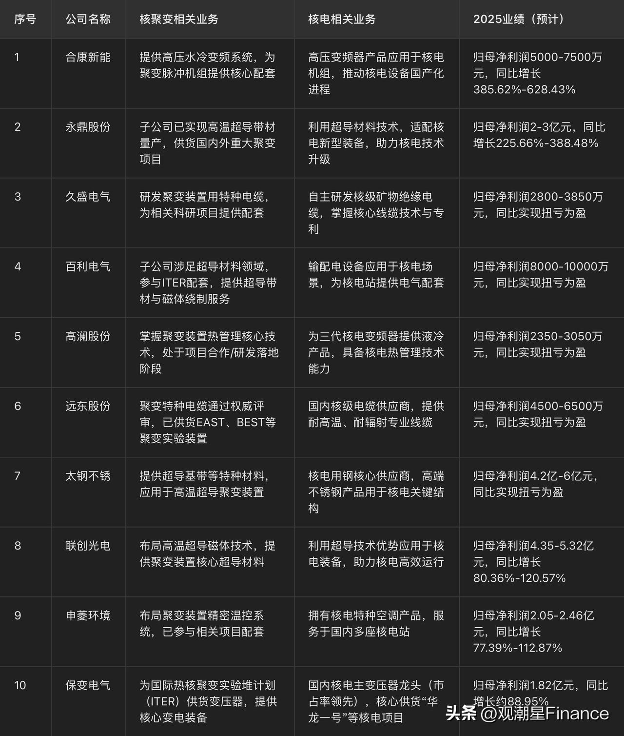 可控核聚变+核电,业绩暴增的10家公司!(校准版) 2026年政府工作报告首次将未来能源列为重点培育产业,能源前沿技术创新上升为国家战略。 产业端,机构测算显示,2026年我国可控核聚变产业项目招标总额较2025年有望增长约5倍。随着“十五五”期间重大装置建设提速,这一领域正加速从研发走向工程化、产业化阶段,相关产业链龙头有望受益。 以下为A股市场中,同时布局可控核聚变与核电两大赛道,并在2025年业绩预告中实现大幅增长或扭亏为盈的10家核心公司(按预告增速/规模排序,仅供研究参考)。