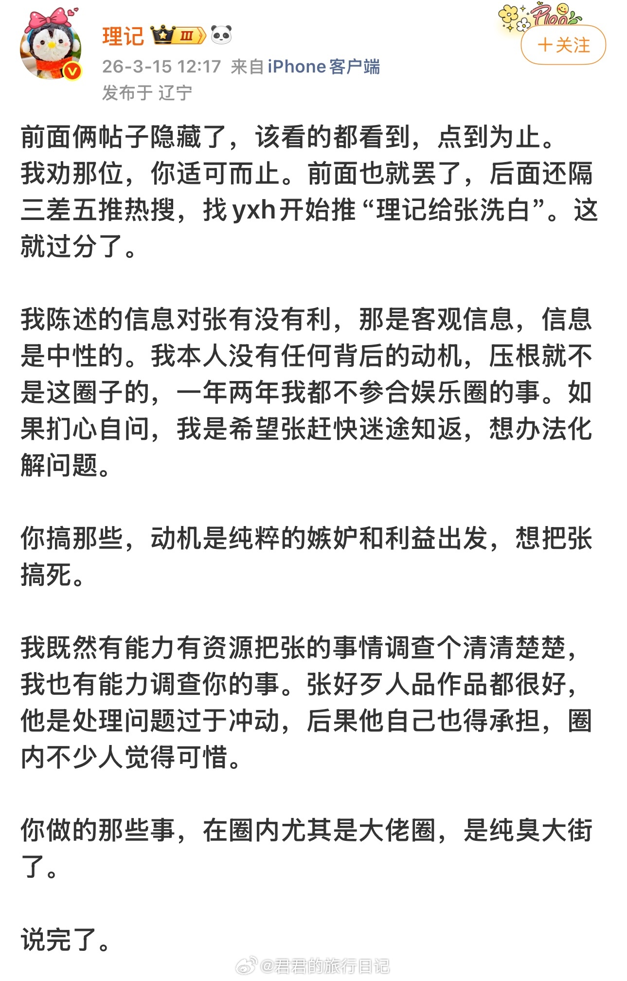 理记发微博,说张艺兴被处罚的事情明明过去两个月,都没人爆,突然被爆出来,是因为某位艺人为了压自己的负面新闻。理记说,当时有人暗中鼓励他发张艺兴,他现在才知道被当枪使了。目前这位明星做的事,在整个娱乐圈都人尽皆知。