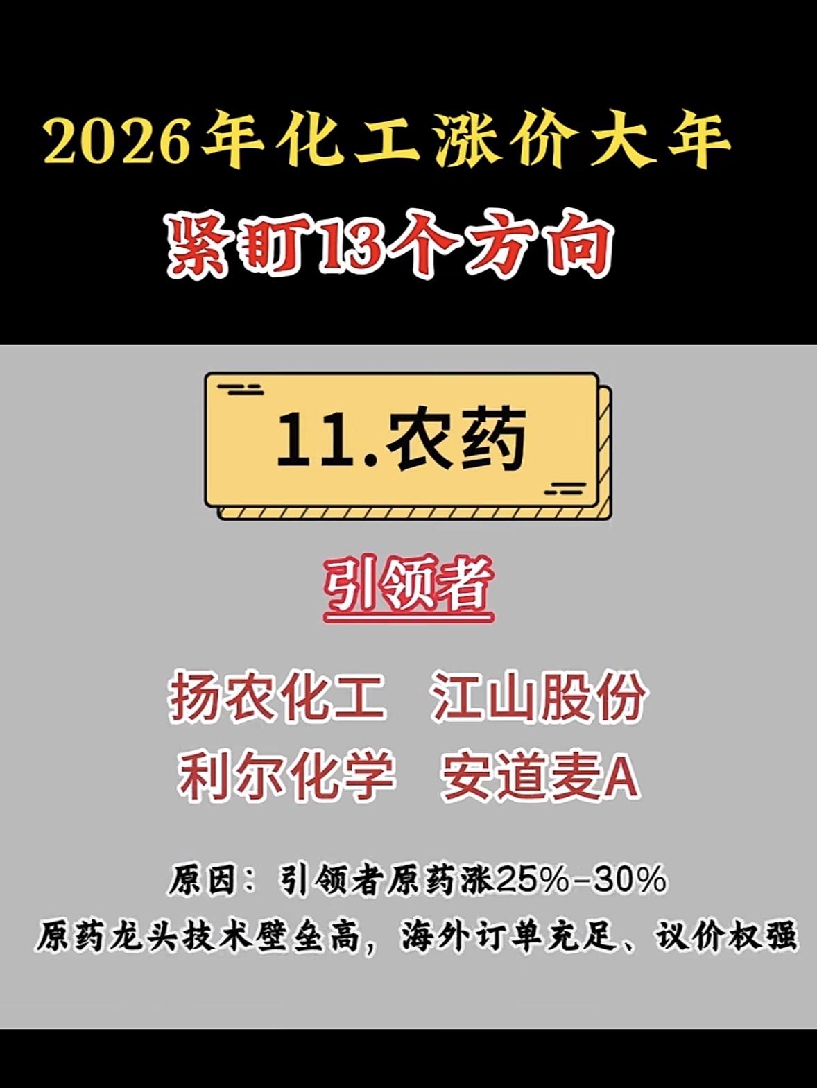 2026年化工涨价大年,13个方向紧盯! 听说2026年是化工涨价大年,有13个方向得紧盯。化工行业和很多领域都息息相关,涨价会带来一系列连锁反应。比如塑料化工品涨价,那下游的塑料制品成本就会增加,像塑料玩具、塑料管材等产品价格可能也会跟着涨。对于企业来说,原材料成本上升,利润空间就被压缩了。而对于投资者,这13个方向可能是潜在的赚钱机会。但投资也有风险,得仔细研究每个方向的市场前景、供需关系等。咱就拭目以待,看看这13个方向到底会掀起怎样的波澜。