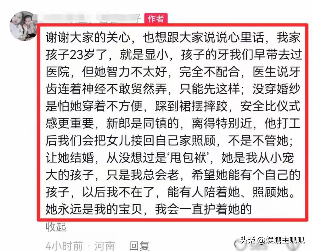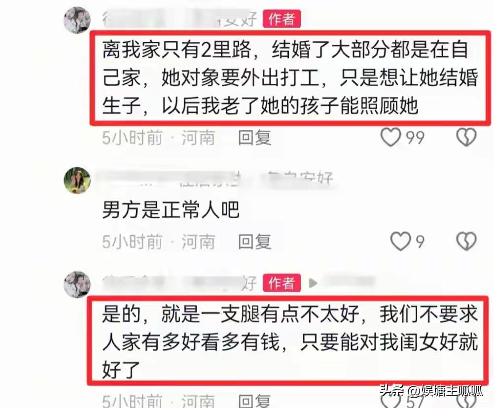 河南智力不全女孩出嫁真相:9.9万彩礼背后,藏着一个母亲最深的爱与痛 (来源:综合网络平台热议事件) 当一则“河南23岁智力不全女子出嫁”的视频冲上热搜,评论区瞬间炸开了锅。有人痛斥婚姻沦为“生育工具”,有人叹息命运不公,但鲜少有人蹲下身来,看看那位母亲眼里的泪光。这桩被贴上“畸形”标签的婚事,真的只是一场冷冰冰的交易吗? 女孩天生智力缺陷,23年来离不开家人的照料。母亲说:“嫁她不是甩包袱,是想给她找个归宿。”这句话背后,藏着一个残障家庭沉默的挣扎——父母会老去,兄弟姐妹会有自己的生活,若无人托付,她的未来该飘向何方? 男方掏出9.9万彩礼,却被悉数存进女孩账户;婚礼未穿婚纱,只因母亲怕她摔倒;婚后她仍常回娘家住……这些细节像一根根针,刺破舆论的偏见。婚姻的形式或许不完美,但那份“让她有人照顾”的初心,沉甸甸地压在一片谩骂声中。 网友质问:“这不是把女儿推进火坑吗?”可现实往往比理想残酷。对于残障群体,孤独终老与相互扶持之间,多数家庭只能咬着牙选后者。这桩婚姻里,没有王子的童话,却有底层人民最朴素的盘算——用微弱的光,照亮彼此泥泞的路。 更令人触动的是,新郎虽患小儿麻痹,却心智健全,愿以细心相待。两个被命运折叠的人,能否在尘埃里开出花?我们无从预言,但至少这一刻,他们握住了比孤独多一点的温度。 而那些高喊“不该生育”的声音,或许忽略了:生命的价值从不只由健全定义。若每一步都按“最优解”行走,人间又何来烟火与泪水?这桩婚姻像一面镜子,照见的不是猎奇,而是每个普通人面对苦难时的踉跄与坚守。 母亲为女儿缝制大红喜服时,针脚里缝进的是祝福,也是无奈。这个世界从不缺完美的批判者,缺的是俯身拥抱残缺的勇气。当我们抛开居高临下的怜悯,才会看见:在生存的缝隙里,爱有时只是一碗热饭、一个陪伴的承诺。 这场婚礼没有玫瑰与誓言,却写满了小人物的抗争。它或许不浪漫,但足够真实——真实到让我们不得不思考:如果换作是自己,又能否交出更完美的答案? 残障群体生存现状 婚姻的本质