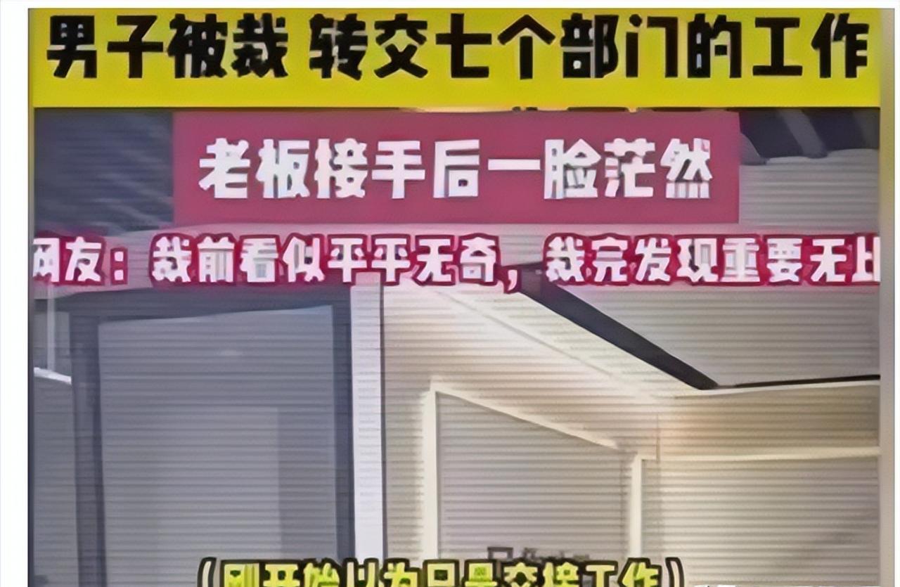 裁员裁到大动脉:杭州一男子被裁,结果交接时,转交了七个部门的工作。老板接手后一脸茫然。网友:裁前看似平平无奇,裁完发现无比重要 事情发生在杭州一家互联网相关的中小企业,最近这两年市场环境不算好,公司营收持续下滑,利润也跟着缩水,管理层急得像热锅上的蚂蚁,想来想去,没琢磨出什么好的增收办法,反倒把主意打到了裁员上。 觉得只要裁掉一批员工,省下工资成本,公司就能缓过来,把裁员当成了降本的捷径,压根没考虑员工的岗位重要性,只看表面是否“显眼”。 筛查裁员名单的时候,管理层几乎没怎么犹豫,就把这位男员工划进了“可优化”队列。在他们眼里,这位男员工就是团队里最“无关紧要”的存在,岗位看着很普通,既不是核心技术岗,也不是管理层,就是一个不起眼的综合协调类岗位。 他平时话特别少,不爱跟领导套近乎,更不会主动邀功,每天按时上下班,不迟到不早退,规规矩矩做好自己的事,从来不会在领导面前刻意刷存在感。 平时绩效考核,他也没有什么亮眼的业绩表现,既没有拿下过重大项目,也没有为公司创造过突出收益,看起来就是那种随时能被替代的螺丝钉,多他一个不多,少他一个不少。 没人注意到,他工位上常年放着一个厚厚的笔记本,封面都被翻得有些磨损,里面记满了密密麻麻的文字和数据。 有各个部门的工作衔接节点、未完成事项,还有各种不易记住的流程细节,甚至标注了每个部门对接人的注意事项。 也没人在意,每天午休时,别人都在刷手机、休息,他的电脑屏幕上总显示着不同部门的工作界面。 有时候是财务的报表核对,有时候是运营的流程衔接,有时候是技术部门的需求对接,他就安安静静坐着,一点点处理那些没人愿意接手的琐碎事务。 就连偶尔加班,他也从不会特意在领导面前表现,都是默默把手里的活儿做完,关好电脑再离开,以至于管理层甚至私下议论,裁掉他不仅能省下一笔工资,还不用费心找人接替,毕竟这么一个“平平无奇”的员工,手里的活儿随便找个人就能接手。 其实公司里早就有一些细微的信号,只是没人放在心上。平时各个部门遇到棘手的跨部门问题,比如销售部和技术部对接需求闹矛盾、行政部和财务部门核对账目出分歧,大家第一个下意识找的就是他,只要他一介入,总能快速理顺流程、化解矛盾,把事情妥善解决。 还有好几次公司遇到紧急事务,比如系统突发故障、客户临时要求修改方案,都是他悄无声息地熬夜加班,协调各个部门赶进度,最后都顺利搞定,没出一点纰漏。 大家只当他是脾气好、肯帮忙,却没人意识到,他早已在不知不觉中,成了公司运转的隐形枢纽,就像那些默默支撑整个单位高效运转的内勤人员一样,没有惊天动地的业绩,却在日复一日的琐碎中,织就了公司各部门衔接的保障网。 他手里的工作,看似琐碎零散,实则串联起了公司七个部门的核心衔接,从流程审批、数据核对,到跨部门协调、应急事务处理,几乎每个环节都离不开他。 直到他被通知裁员,办理交接手续的时候,大家才彻底傻眼。他打开电脑,一一列出自己的工作内容,足足涉及行政、财务、销售、技术、运营、采购、售后七个部门,每一项工作都有详细的流程说明和注意事项,光交接清单就列了满满三页。 老板亲自过来接手,听着他讲解各项工作的衔接点、隐藏的问题和注意事项,越听越茫然,脸上的表情从不在意变成了震惊,最后彻底僵住,这才反应过来,自己裁掉的不是一个可有可无的螺丝钉,而是公司运转的“主动脉”。 交接完成后,这位男员工收拾好自己的东西,默默离开了公司。而他走后,公司的麻烦才真正开始:七个部门的工作衔接瞬间断层。 跨部门沟通频频出问题,之前他悄悄搞定的隐患接连爆发,报表核对出错、流程审批停滞、客户投诉增多,几个项目因为衔接不畅被迫暂停,公司损失惨重。 这段交接的画面被在场员工偷偷拍下来发到网上,很快就火了,网友们纷纷留言吐槽,裁前看似平平无奇,裁完才发现无比重要,这哪里是裁员,分明是自断后路。 其实最近这两年,不少企业都在搞“降本增效”,裁员成了常见操作,但很多企业都犯了和这家杭州公司一样的错,只看员工表面的业绩,忽视了那些默默付出、支撑公司运转的“隐形核心”。 只盯着员工的工资成本,只看表面的业绩表现,却忽略了那些默默付出、不擅张扬的核心员工。他们就像公司的承重墙,平时看不见、摸不着,可一旦被拆掉,整个公司的运转都会出现问题。