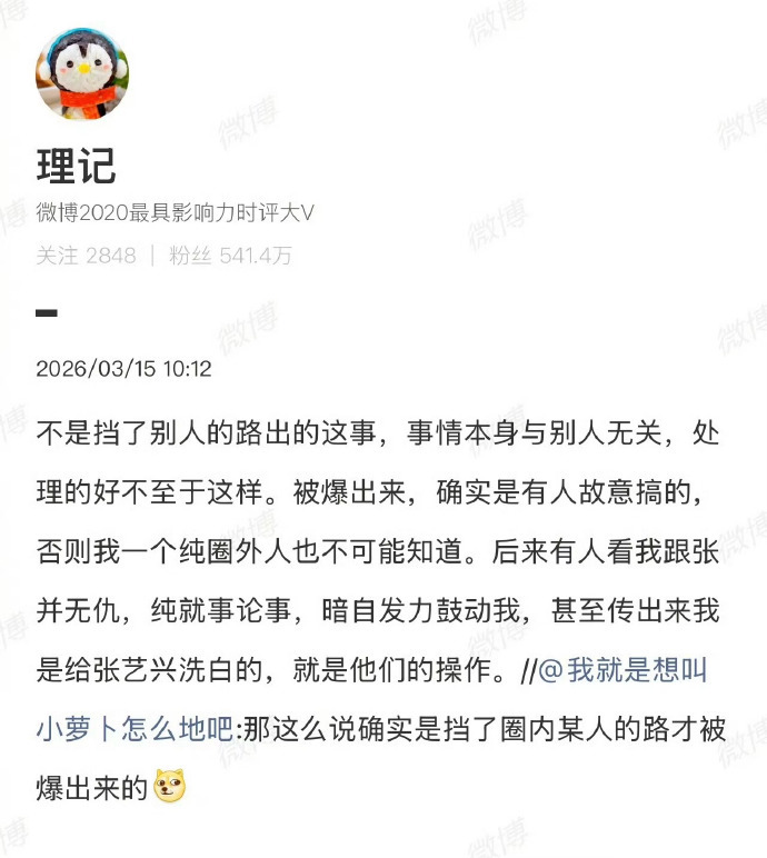理记发微博说张艺兴被处罚的事情之所以被爆,是因为某位艺人为了压自己的负面新闻,顺便干掉竞争对手,所以拿张艺兴挡枪,但张艺兴这事也没有冤枉他呀?