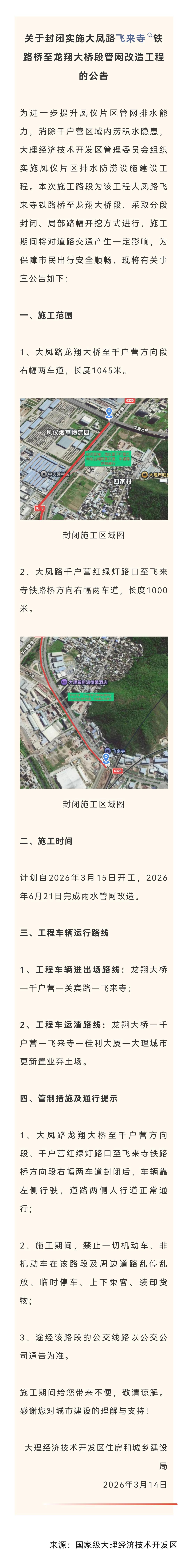 3月15日起,大理大凤路飞来寺铁路桥至龙翔大桥段要施工了。 这次是为提升凤仪片区管网排水能力、消除内涝隐患。施工采取分段封闭、局部路幅开挖。 施工范围包括大凤路龙翔大桥至千户营方向段右幅两车道(1045米)和千户营红绿灯路口至飞来寺铁路桥方向右幅两车道(1000米)。 从2026年3月15日开工,到6月21日完成雨水管网改造。工程车辆也有特定运行路线。施工期间,相关路段右幅两车道封闭,车辆靠左侧行驶,大家出行可得多留意,别乱停车,免得给自己和他人添堵。 施工 大理水利工程 大理市政工程