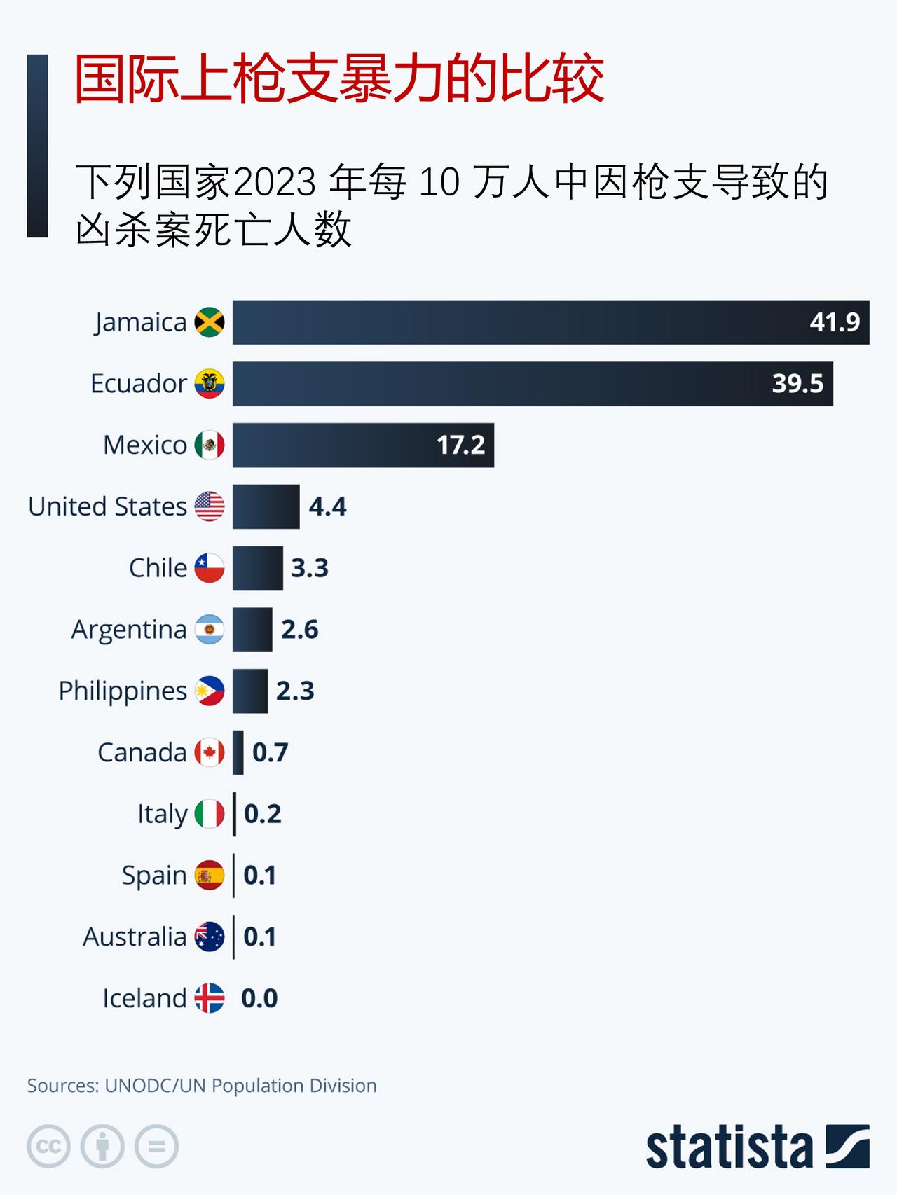 国际上哪个国家枪支暴力最严重?你可能说是美国,其实不是的。 全球范围内枪支暴力的情况差异巨大。根据联合国毒品和犯罪问题办公室 2023 年的数据,在所研究的国家中,牙买加的枪支杀人率最高,每 10 万人中有 41.9 人死于枪击,紧随其后的是厄瓜多尔,为 39.5 人。在国际比较中,墨西哥的表现也十分突出,每 10 万人中有 17.2 人死于与枪支有关的杀人事件。 美国的情况虽然远逊于上述拉丁美洲和加勒比地区的热点地区,但在发达经济体中其枪支杀人率仍处于相对较高的水平,每 10 万人中为 4.4人。相比之下,许多发达国家的枪支杀人率仍然很低,比如加拿大(0.7)、意大利(0.2)以及澳大利亚和西班牙(均为 0.1)。冰岛在 2023 年没有发生一起枪支杀人事件。 总的来说,这些数据凸显出明显的地区差异,枪支暴力现象在拉丁美洲和加勒比地区的部分地区尤为严重。与此同时,大多数拥有严格枪支管制措施的高收入国家,其与枪支相关的杀人案件数量相对较少。