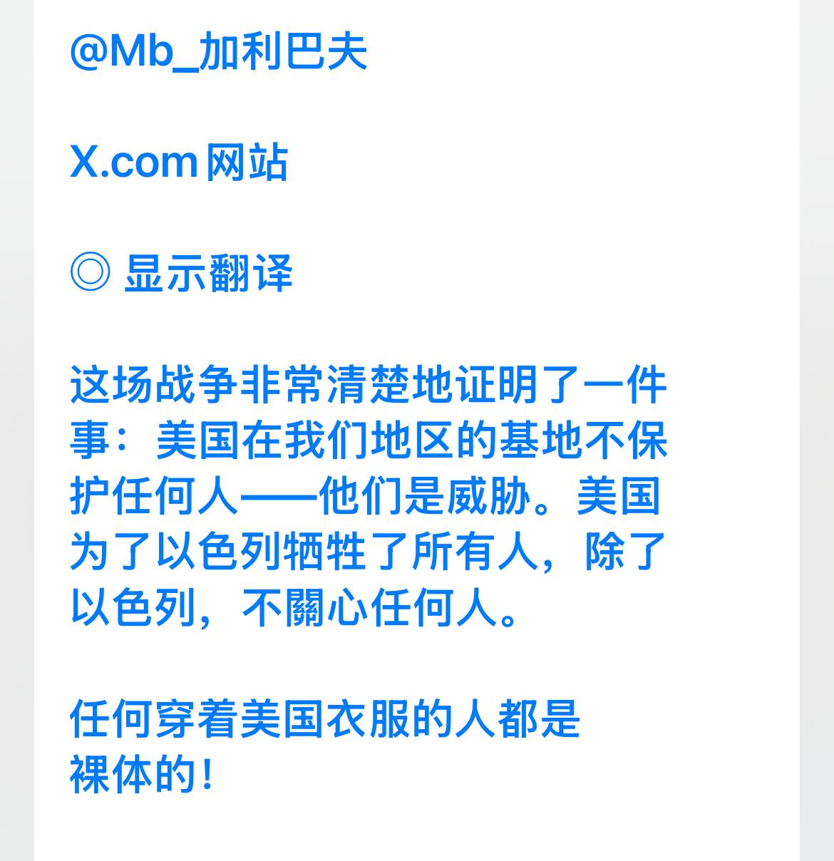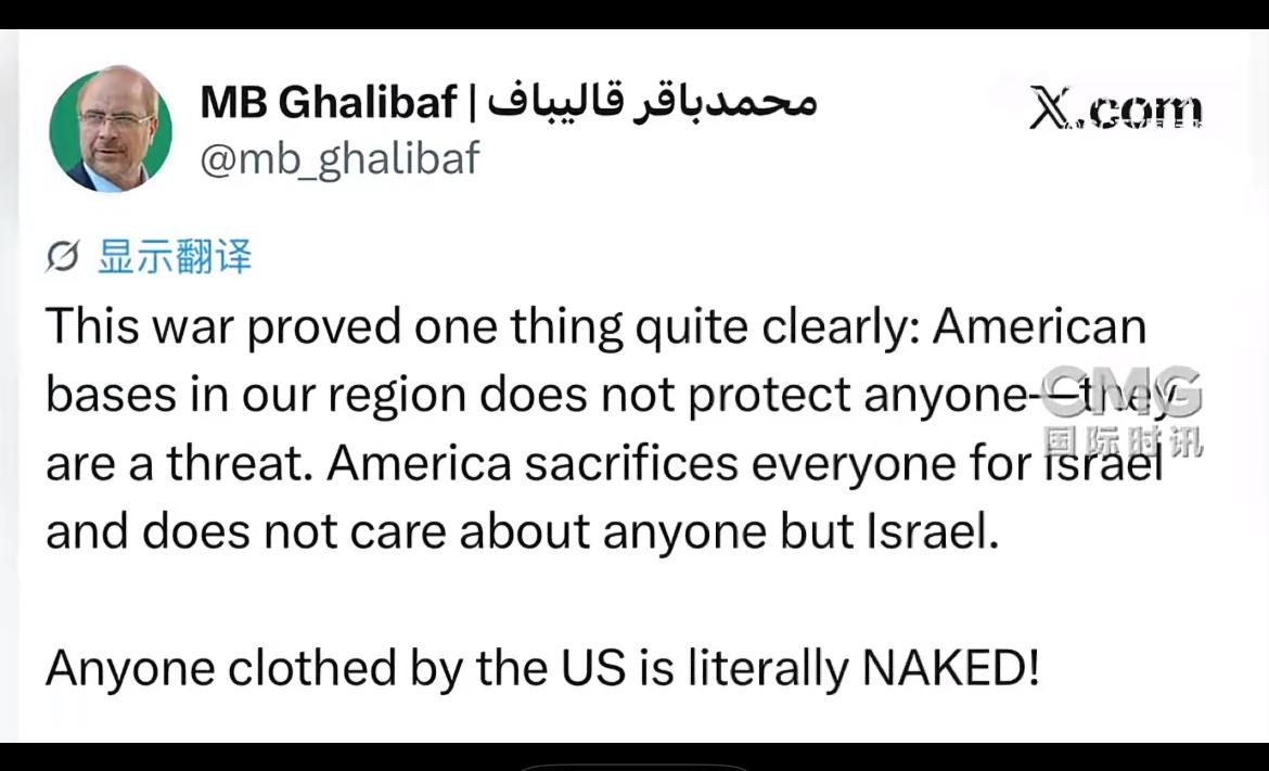 伊朗议长宣称:美军基地无力护人! 当地时间3月14日,伊朗议长卡利巴夫于其社交媒体发文指出,散布在中东地区的美军基地非但无法保护任何人,反倒成为了威胁之源。卡利巴夫表示,本轮冲突已然证明,美军在该地区的军事存在无法带来安全。他还称,美国只为以色列利益牺牲他人,不会真正考虑其他国家利益。 实际上,美国在中东地区的军事布局早已饱受指责。这些美军基地表面打着维护地区稳定的幌子,实则是美国推行霸权主义的工具。 从伊拉克战争到叙利亚危机,美军的踪迹处处可见,给当地带来了无尽的痛苦、灾难与严重的破坏。而美国却在这些冲突中大发战争财,通过掌控石油资源等方式获取巨额利益。 由此可见,美国虽声称保护盟友,但在实际行动中,常把盟友当作战略棋盘上的棋子。 就像以色列,在美国的支持下不断扩张领土,加剧了巴以之间的矛盾。而其他中东国家,在美国的军事干预下,主权和安全遭受严重威胁。 如今,伊朗议长的这番言论,无疑是对美国在中东军事存在的有力批判。