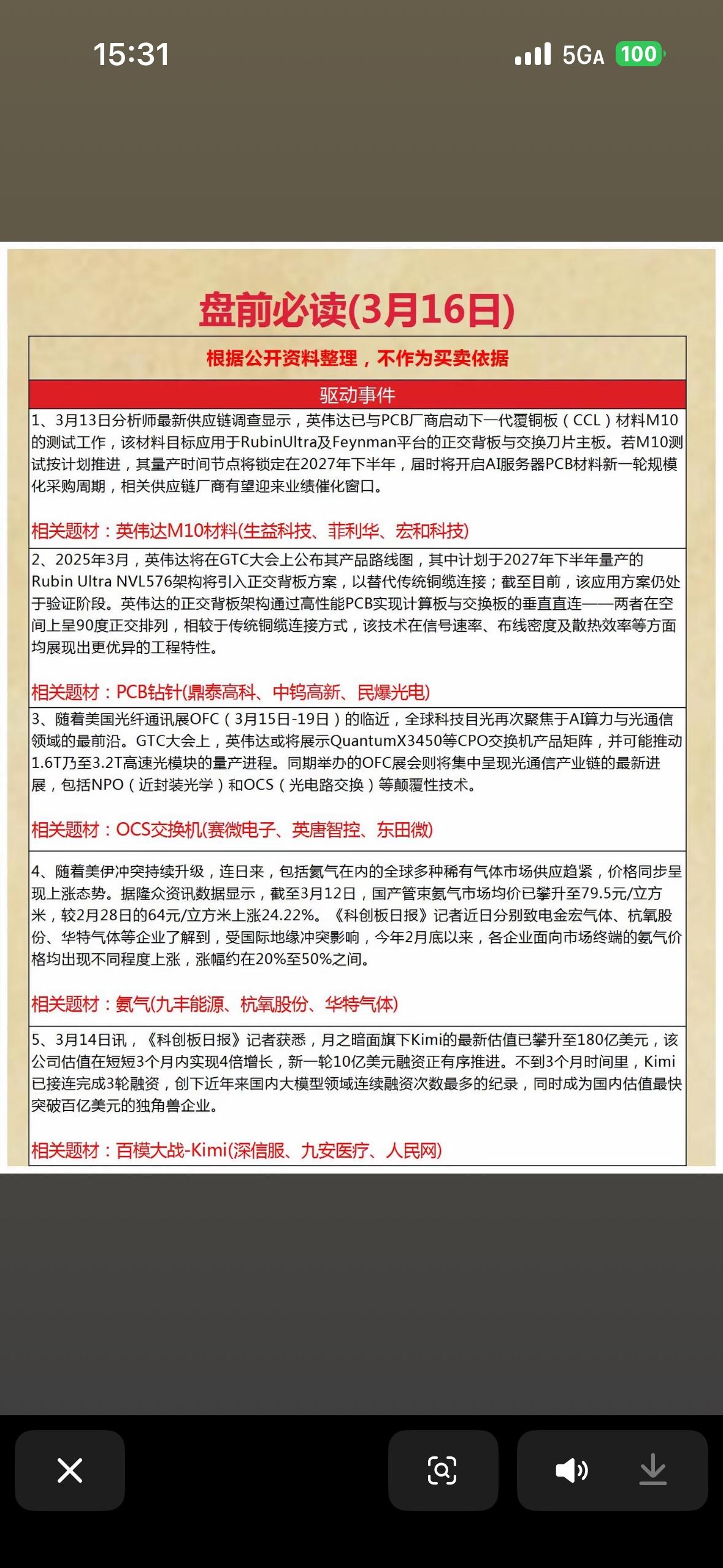 3月16日盘前必读!3月16日 📝 每日精选财经资讯,助你把握市场先机!📈💰 3月16日盘前资讯来啦!先说说A股盘前竞价,很多人疑惑能不能成交,答案是能。这阶段叫开盘集合竞价,若提交订单且价格匹配,系统会在9点25分集中撮合成交,并非要到9点30分。9点15分到9点20分可自由挂单撤单,盘面波动大,我一般只观察。 再看盘前研报,新宙邦竞争优势明显。中泰证券指出,其发布限制性股票激励计划草案,首次授予价30.47元/股,激励对象达157人,业绩考核目标高,彰显管理层对公司未来发展的信心。这些信息,助你把握市场先机。