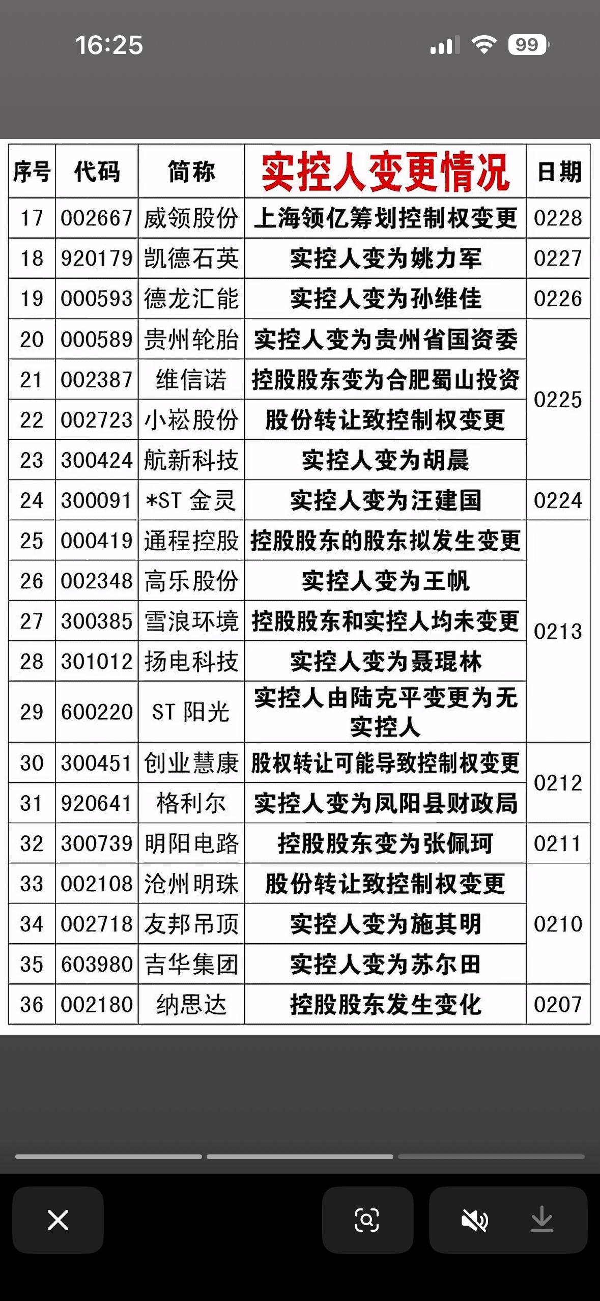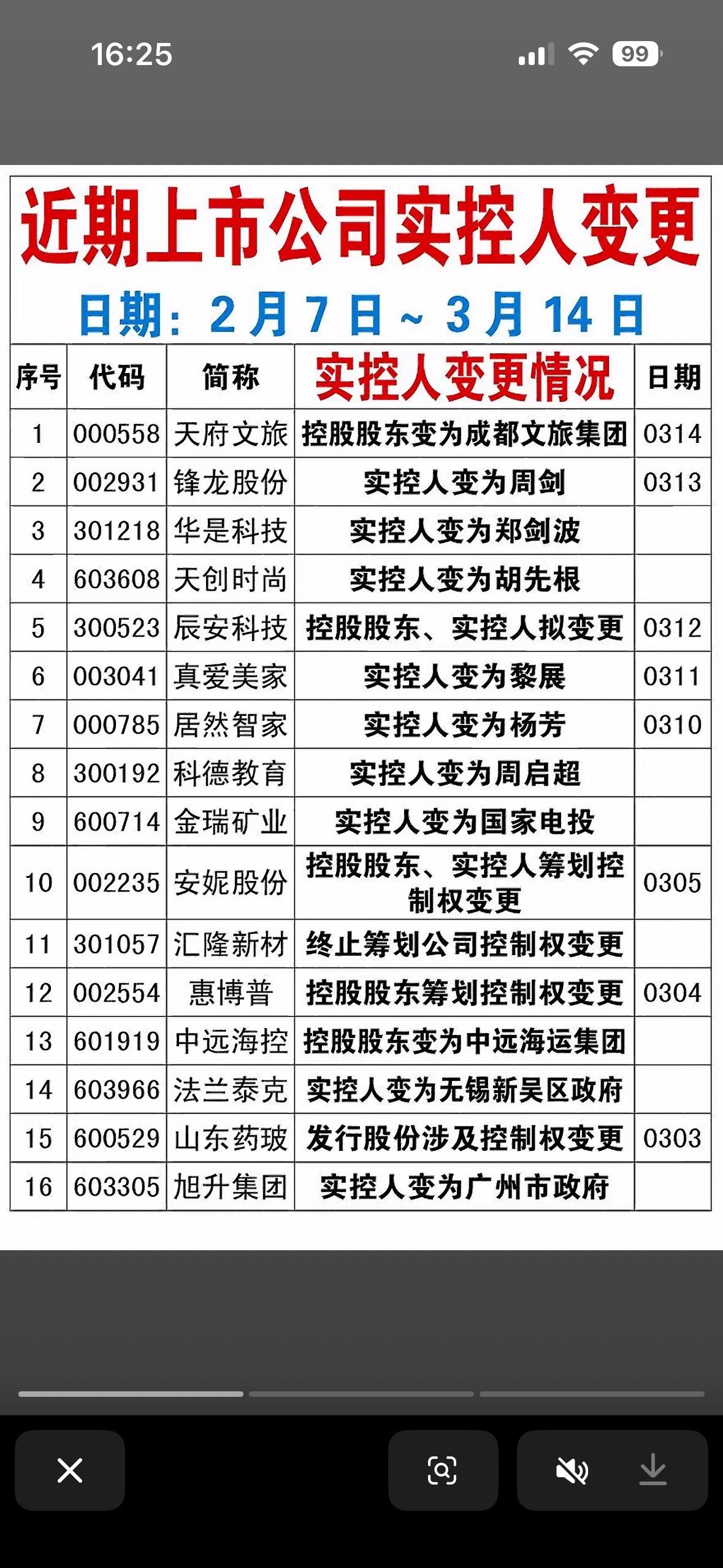 3月15日实控人变更情况一览。 高金集团转让、尹佳音接任、江西省国资委接管 3月15日实控人变更情况挺值得关注。高金集团转让,尹佳音接任,江西省国资委接管,这一系列变动背后肯定有不少故事。 就像之前皮阿诺易主,马礼斌押注恒大苦苦支撑7年后离场,实控人变为尹佳音,这象征着强绑定疯狂造富时代的终结。还有3月9日金瑞矿业,控股股东青海省投权益变动,实控人从无到国家电投。实控人变更往往会给公司带来新的发展方向和机遇,也可能伴随着挑战,不知道这次3月15日的变更又会让相关企业走向何方。