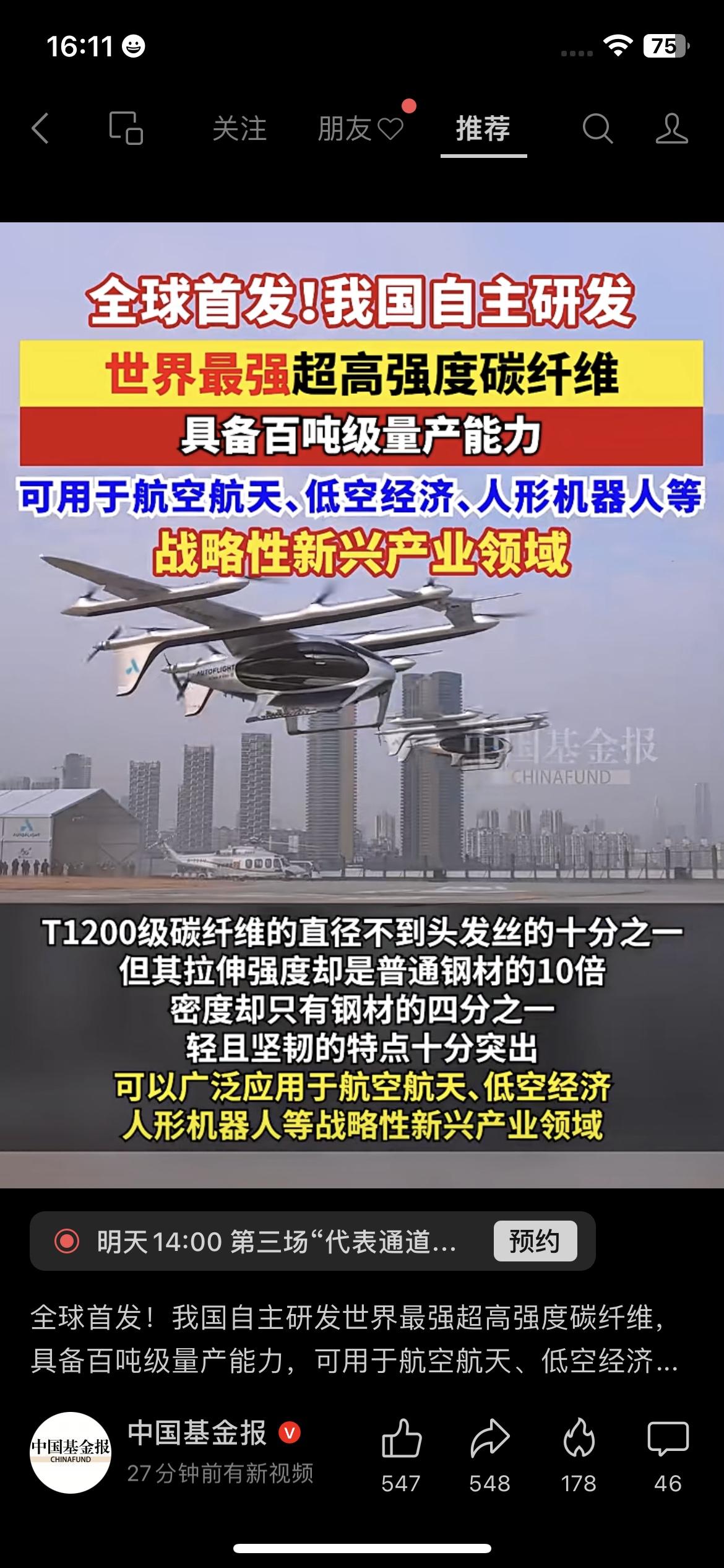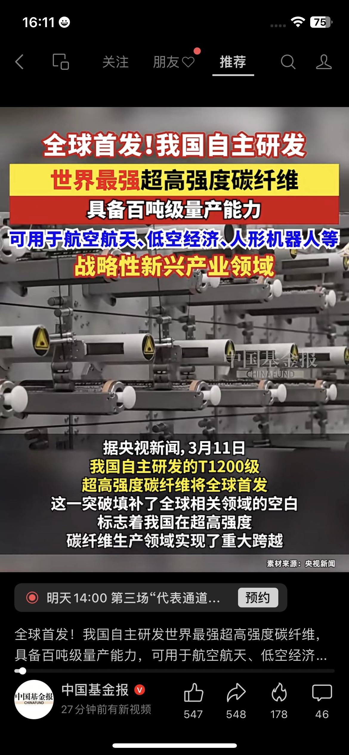全球空白被填补!我国首发T1200级超高强度碳纤维,百吨级量产实现重大跨越 重磅消息!我国自主研发的T1200级超高强度碳纤维全球首发,而且已经具备百吨级量产能力,这意味着我国在超高强度碳纤维生产领域实现了重大跨越! 据央视新闻报道,这次首发的T1200级超高强度碳纤维并非实验室样品,而是已经实现工业化量产的产品,填补了全球相关领域的空白。要知道,超高强度碳纤维是航空航天、低空经济、人形机器人等战略性新兴产业的核心材料,之前全球相关技术一直被少数国家垄断,现在我国终于实现了突破。 这不仅是技术上的重大进步,更是咱们国家制造业实力的体现。航空航天领域用这种碳纤维,能让航天器、飞机更轻、更强;低空经济、人形机器人领域用它,能提升产品的性能和安全性。这对咱们国家的战略性新兴产业发展,有着至关重要的意义。 作为普通人,看到咱们国家在核心材料领域实现突破,真的特别自豪。从被卡脖子到自主量产,这背后是无数科研人员的日夜攻关,也是国家制造业升级的缩影。为中国智造点赞! 中国智造 碳纤维 航空航天 科技 民生碳纤维工艺流程