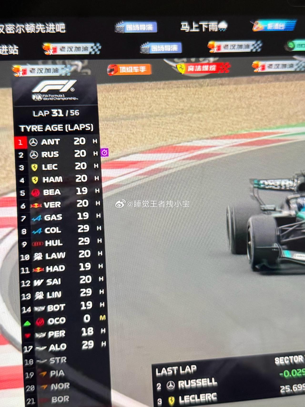 中国大奖赛跑了31圈了,又回到了熟悉的梅奔领跑节奏,不同的是安东内利领跑,拉塞尔第二。 法拉利又开始内斗了,乐扣超过老汉,老汉注定没有领奖台。