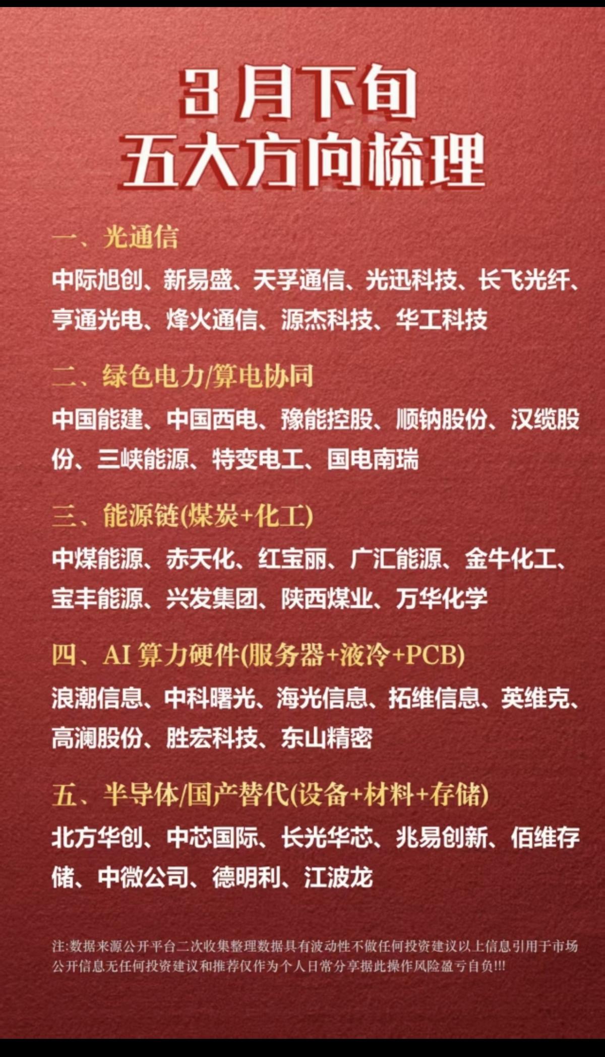 3月下旬:五大热点+核心方向! 1.光通信 2.绿色电力+算电协同 3.能源链(煤炭+化工) 4.人工智能AI算力硬件(液冷+PCB) 5.半导体+国产替代(设备+材料+存储) 相关核心龙头股: